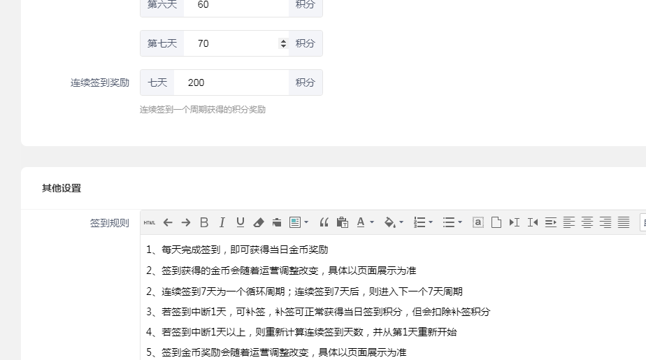 ### 签到设置 _1610613549.jpg) 1、每天完成签到,即可获得当日积分奖励 2、连续签到7天为一个循环周期;连续签到7天后,则进入下一个7天周期 3、若签到中断并不选择补签,则重新计算连续签到天数,并从第1天重新开始 可以开启签到和补签功能  签到规则可自行设置