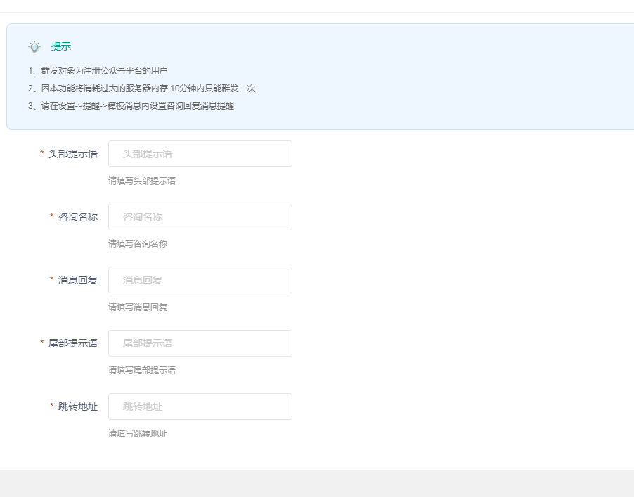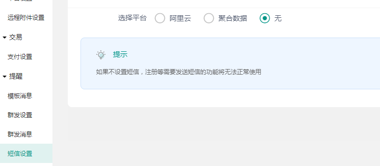 ### 提醒 1.咨询回复消息提醒:用于私信,红包群发,关注商家群发; 2.工单任务通知:用于信息审核结果,点赞,收藏,评论通知; 模板消息这个也要设置,如果没设置用户将不会收到提醒,然后发帖可能发不出去 _1610594991.jpg) 群发端口设置,用默认的即可  群发消息  这里查看群发记录,点击发送  1、群发对象为注册公众号平台的用户 2、因本功能将消耗过大的服务器内存,10分钟内只能群发一次 3、请在设置->提醒->模板消息内设置咨询回复消息提醒 短信设置,这个必须设置,不设置将无法正常使用 支持阿里和聚合短信