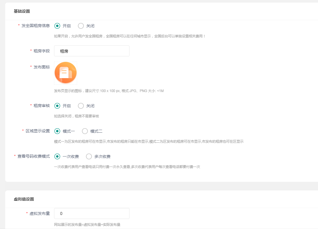 ### 租房设置  发布图标在首页发布集合页展示 收费模式:一次收费代表用户查看电话只用付费一次永久查看,多次收费代表用户每次查看电话都要付费一次  下面的设置跟之前原理一样