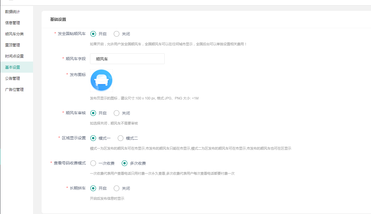 ### 顺风车基本设置  设置和其他设置方法和原理一样  网站展示的顺风车量=虚拟顺风车量+实际顺风车量 全部设置好点击保存即可