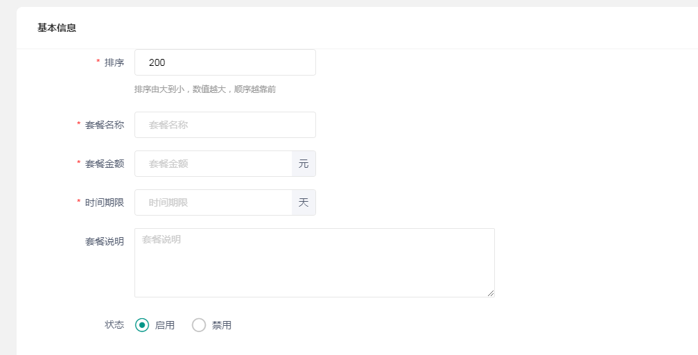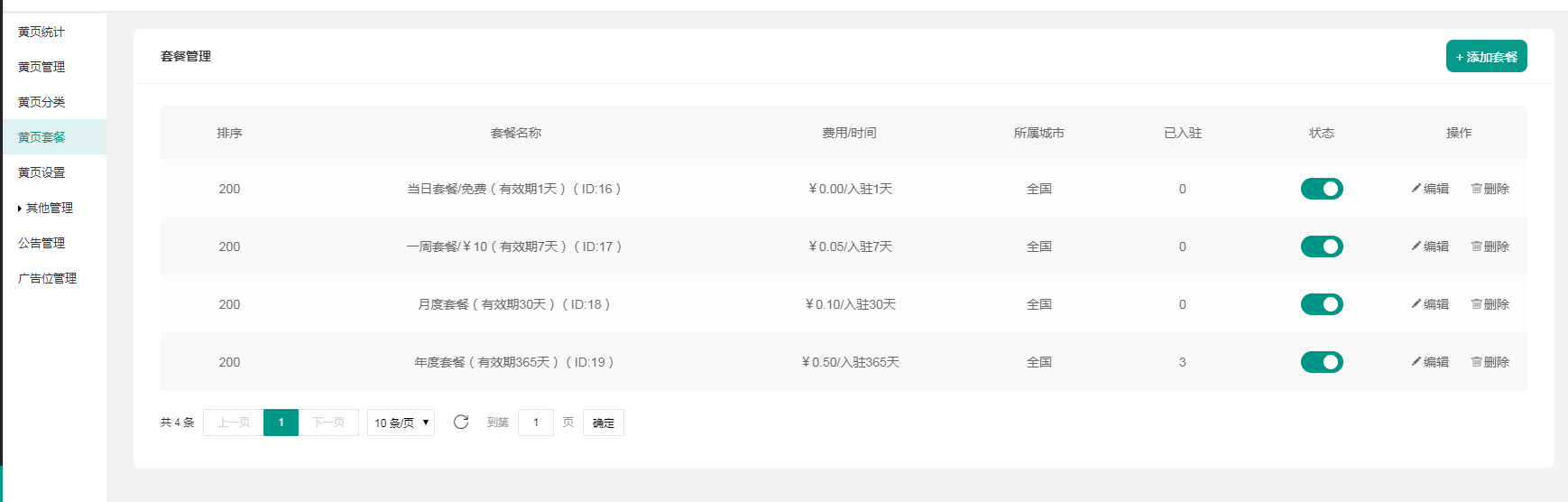 ### 黄页套餐  黄页套餐,可以设置时间城市和入驻费用 可进行删除、新增和编辑 点击添加套餐,填写基本信息即可