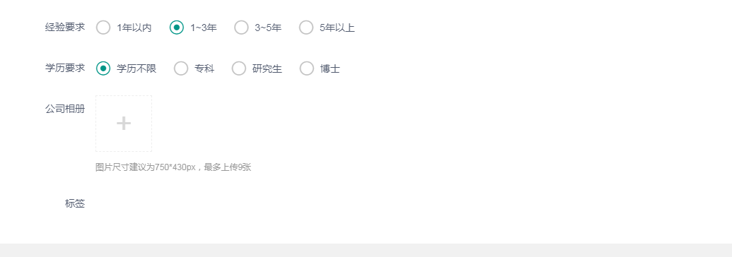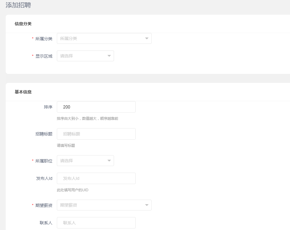 ### 招聘管理 _1610605926.jpg) 这里管理招聘信息,可进行批量操作 点击发布招聘  分类、区域、所属职位、发布人ID必填 没有分类和职位的需要先添加   标签在分类里设置