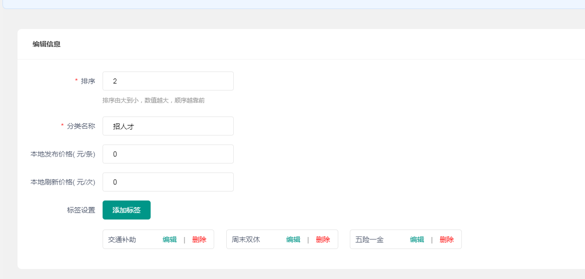 ### 分类管理  导入默认值后修改内容  价格和标签在这里设置 找工作多了查看电话一项,有人需要查看人才电话此功能生效