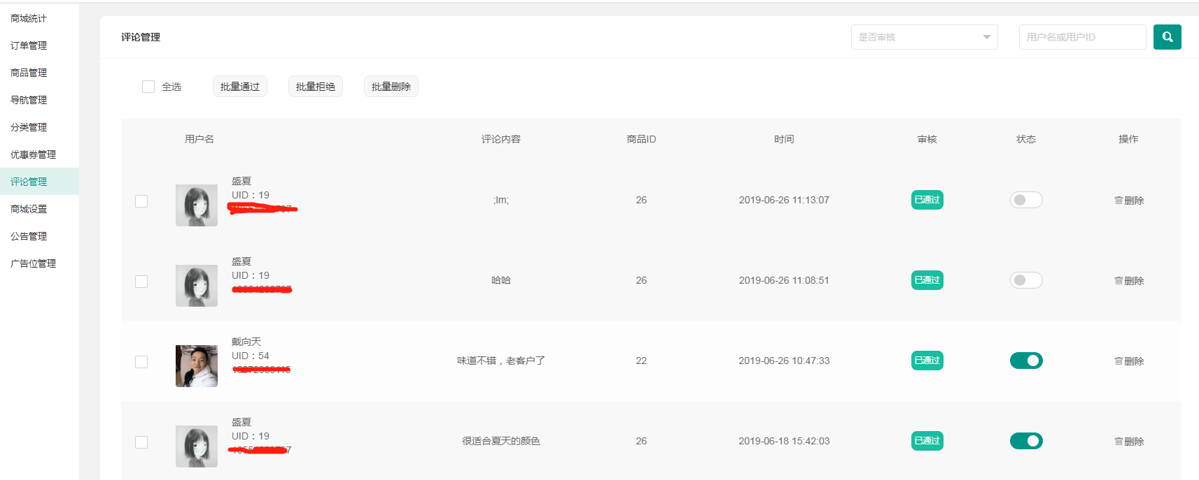 ### 商城评论管理  此处的评论是商品的评论,跟淘宝上买东西评价一样,可进行批量操作