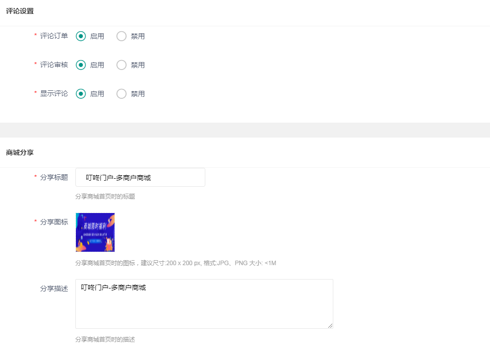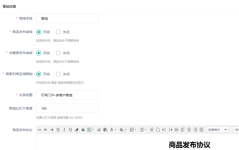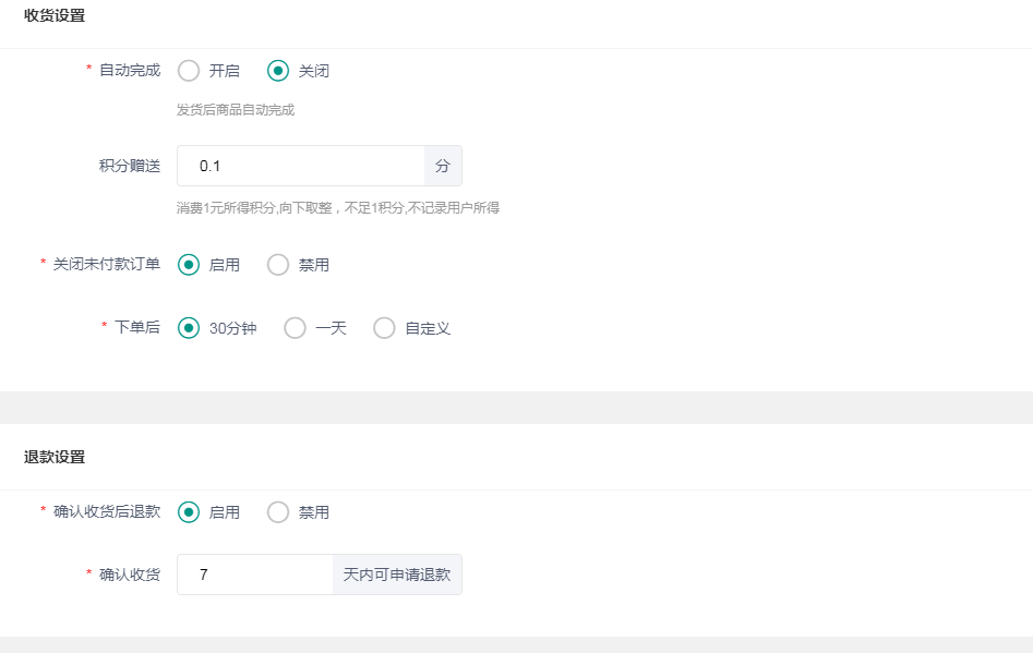 ### 商城设置  商城字段是可以自定义的 商城幻灯片高度是控制幻灯片高度的,高度范围再100-400内  自动完成的意思是,商品发货后自动完成 积分赠送,最低填1分 关闭未付款订单,如果设置为30分钟,30分钟后没付款,订单将自动关闭 确认收货退款,如果禁用那么订单完成后将不能申请退款  下面都是开关,根据情况开启和关闭
