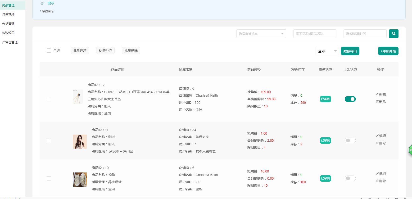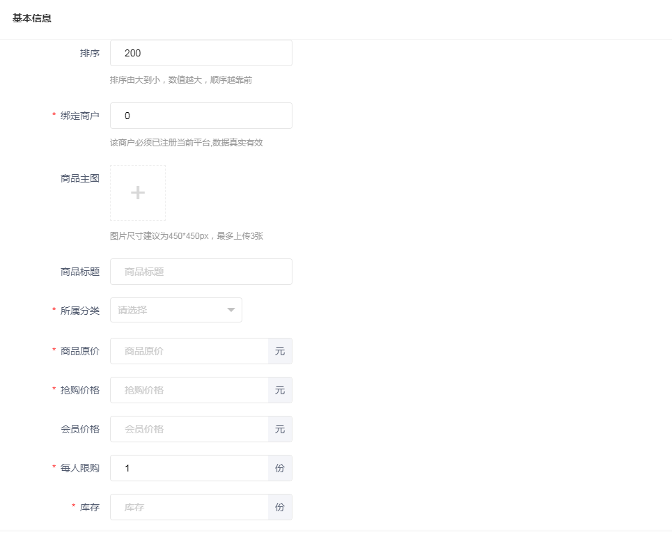 ### 抢购商品管理  可进行批量操作,主要功能用来审核商家发布的抢购商品,我们也可以自己在后台添加抢购商品 点击添加商品  绑定商户,该商户必须已注册当前平台,数据真实有效,填写商户的ID即可,商户ID在商家管理页面查看 所属分类必填,注意填写每人限购数量,和库存数量  音频连接地址支持.mp3结尾的,视频连接支持.mp4结尾的 设置好开始和结束时间,核销截止时间意思是,在这个时间段内可以核销,过了这个时间段后订单作废,核销截止时间必须晚于抢购截止时间 如果选择快递发货,则不需要 精选的意思跟推荐差不多,会出现在单独的类别里