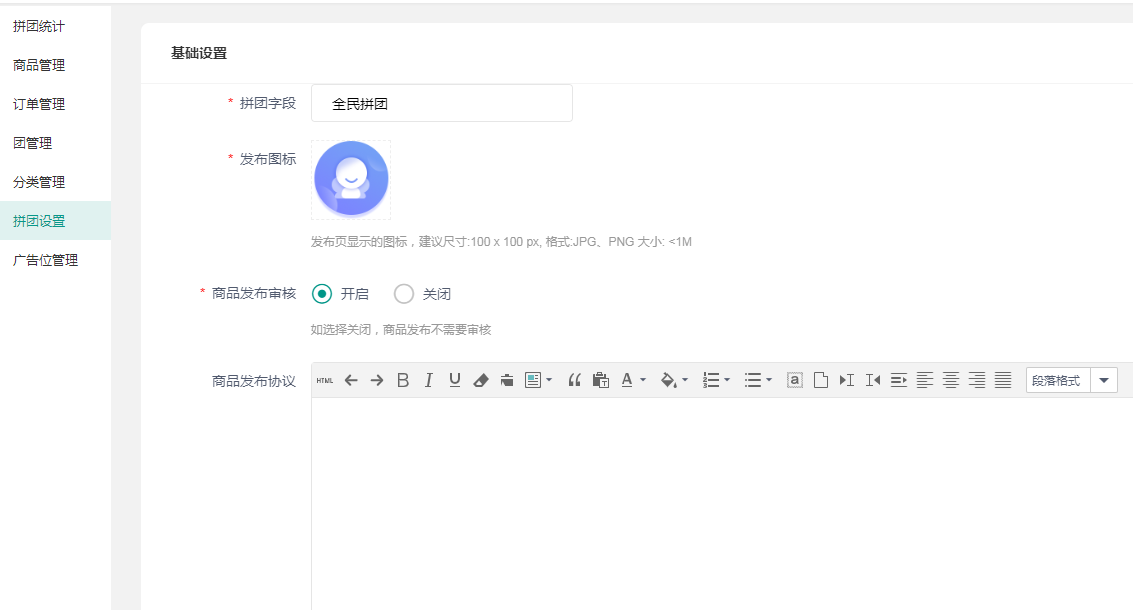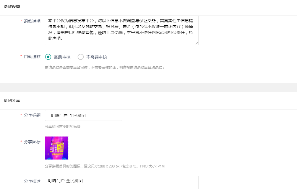 ### 拼团设置  拼团字段自定义,退款说明,自动退款开启后,如果微信支付商户有钱则会自动退款,如果没钱则不会退,开启后需要保证微信支付商户内有钱