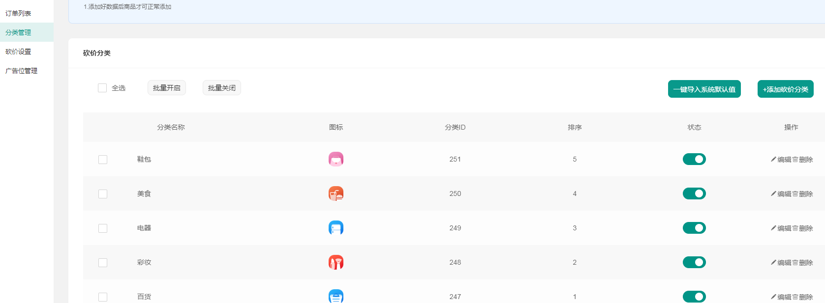 ### 砍价分类  一级分类,可导入默认值,也可以自己添加和删除