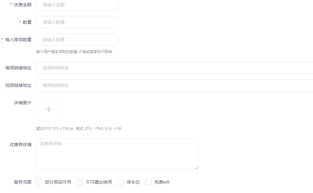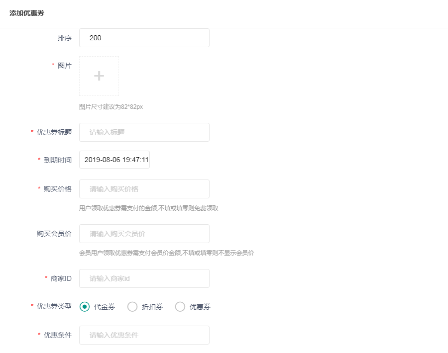 ### 优惠卷列表  可进行批量操作管理优惠卷,点击领取列表可查看该卷的领取情况  点击添加优惠卷  到期时间,意思是优惠卷的时效,过期作废 代金券,可设置条件,满多少减多少 折扣卷,设置折扣 优惠卷,跟代金券功能一样 可限制没人领取数量