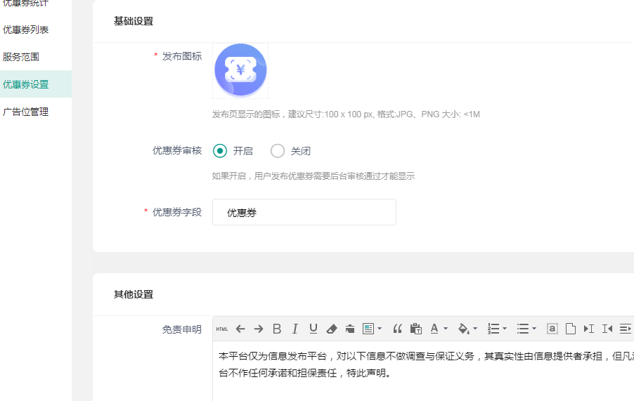 ### 优惠卷设置  优惠卷字段自定义,设置内容较简单