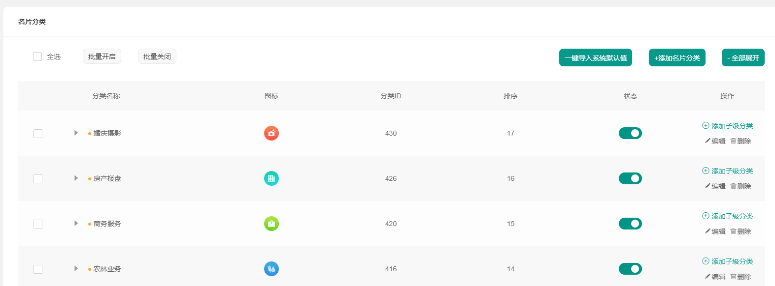 ### 名片分类  二级分类,可进行批量操作 批量开启前先点击全部展开 添加一级分类只需填写排序、名称和图标
