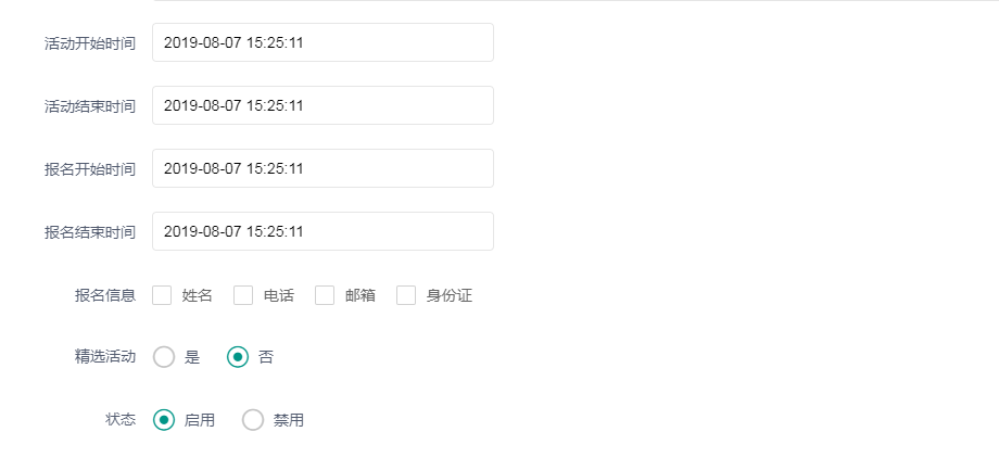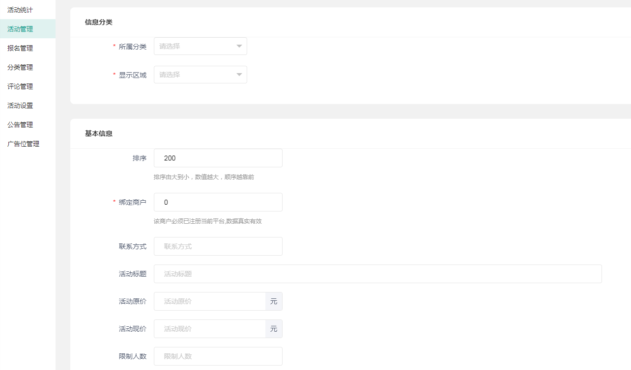 ### 活动管理  可进行批量操作,点击查看可查看此活动报名详情  点击添加活动  活动必须绑定商户,下面的根据提示填即可  活动开始时间和活动结束时间必须晚于报名时间