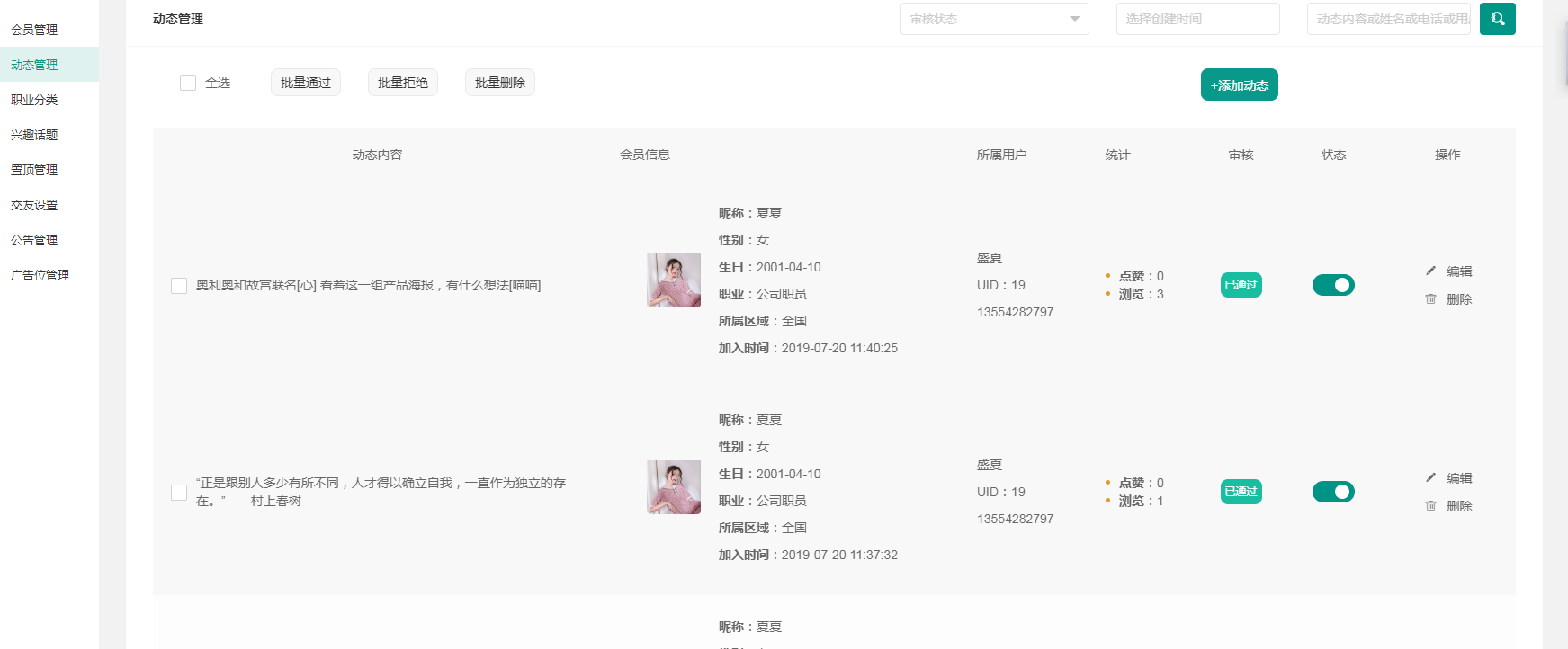 ### 动态管理  这里可以查看所有动态信息,可以对动态进行批量操作,可以直接编辑修改用户动态,也可以直接添加,小程序没有此功能 点击添加动态,用户ID必填