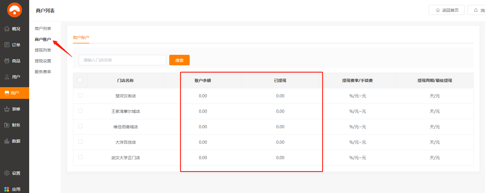 访问路径:餐饮后台>>商户>>商户账户 介绍:用户平台管理员查看各个商户的账户情况,查看提现设置参数