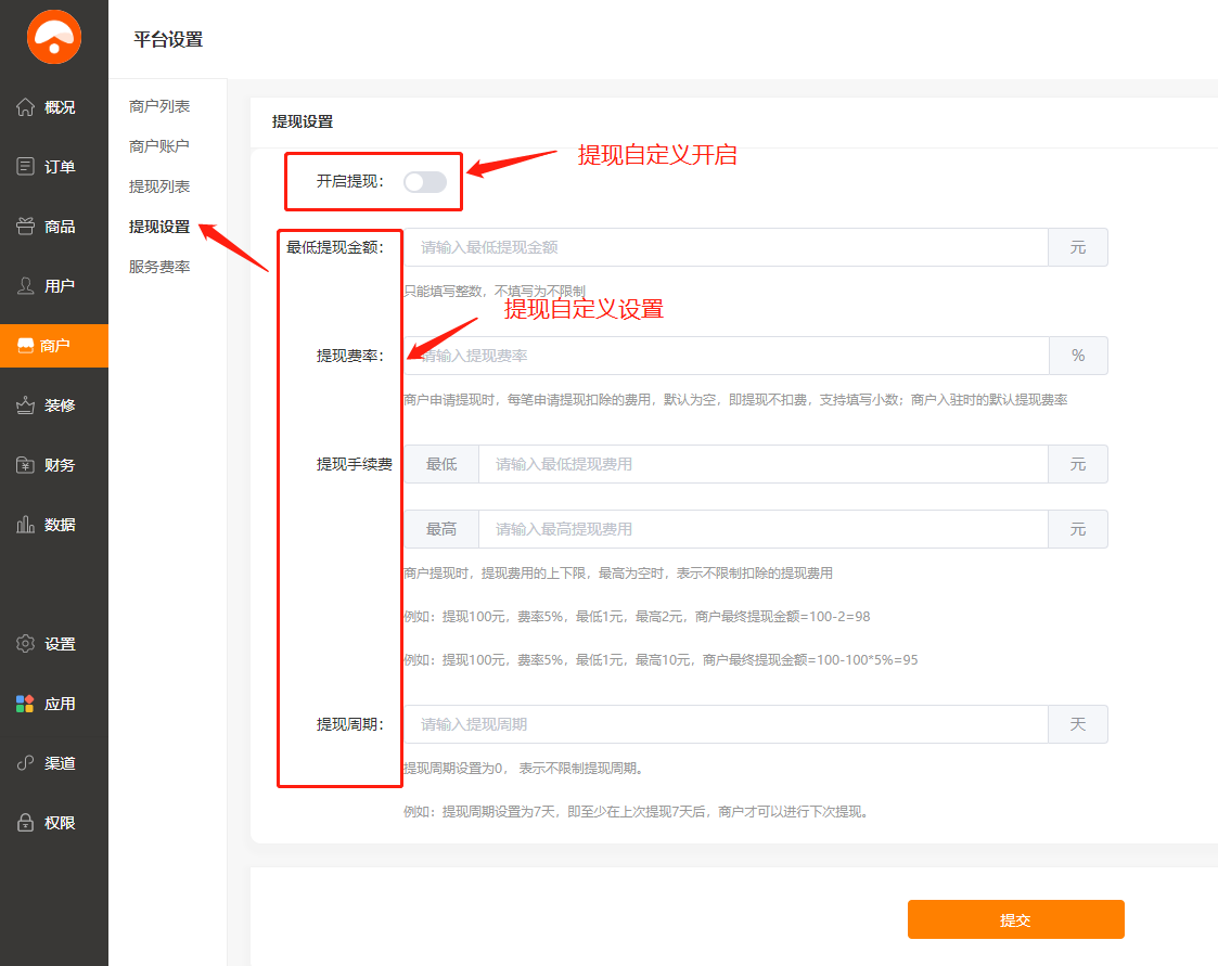 访问路径:进入后台>>商户>>提现设置 介绍:用于设置提现的费率、提现周期、最低提现金额及提现手续费等参数