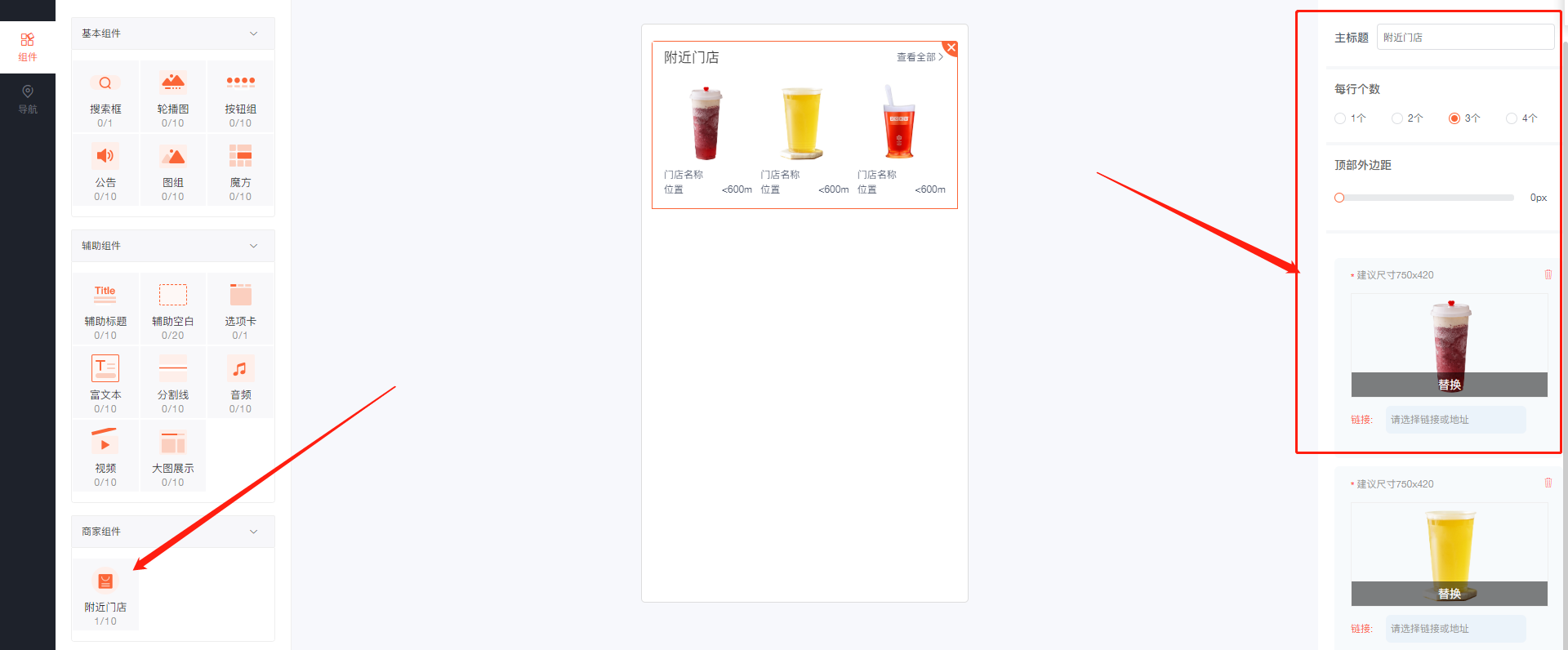# 装修页-商家组件介绍  # 附近门店: 1、排序按距离展示,标题可一定以; 2、自定义页面显示个数,若超出,组件可左右滑动切换显示; 3、可上传外部图片,图片链接自定义添加。