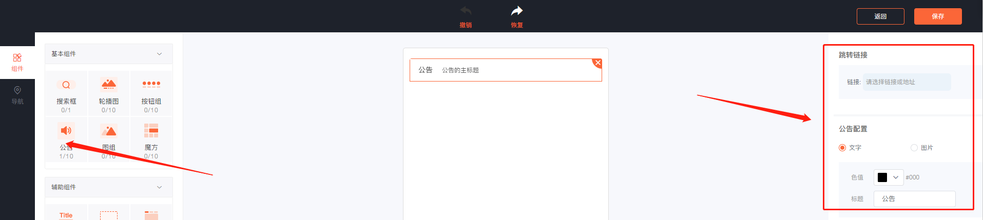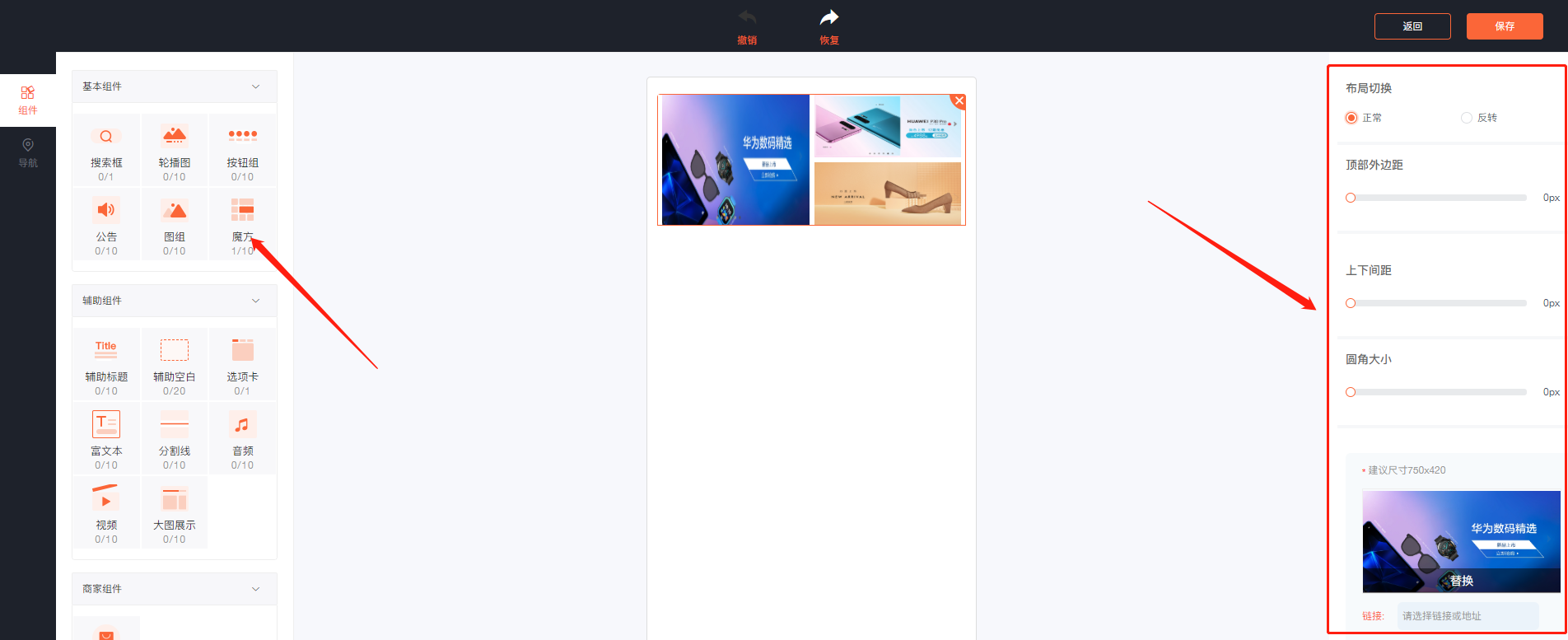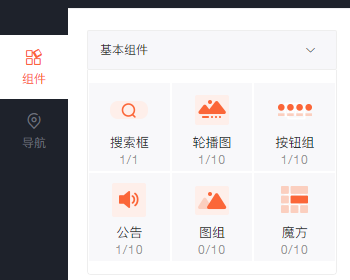 # 装修页-基础组件介绍装修页-基础组件介绍  # 搜索框: 1、左侧可显示店铺名称,方便切换店铺; 2、自定义搜索提示文字; 3、自定义搜索框边角样式; 4、自定义搜索框高度;  # 轮播图: 1、自定义轮播图圆角大小; 2、自定义图片高度; 3、自定义轮播图切换速度; 4、可上传外部图片,图片可添加链接,链接包括入口页面链接、小程序跳转链接、拨打电话和外部网页链接。     # 按钮组: 1、自定义每行按钮数; 2、自定义按钮行数,如:设置1行按钮,每行5个,按钮数超出5个的话,按钮组可左右滑动切换; 3、自定义按钮形状; 4、自定义按钮组文字颜色和文字; 5、按钮组可上传外部图片,图片可添加链接,链接内容同上。  # 公告: 1、公告可跳转链接,链接内容同上; 2、公告标题可设置文字标题,也可上传图片标题; 3、公告内容单独添加  # 图组: 1、自定义一行显示个数; 2、自定义组件上下左右间距; 3、自定义图片圆角和图片高度; 4、可上传外部图片并给图片添加链接,链接内容同上  # 魔方: 1、布局可左右切换; 2、自定义组件上下间距; 3、自定义图片圆角; 4、可上传外部图片并给图片添加链接,链接内容同上
