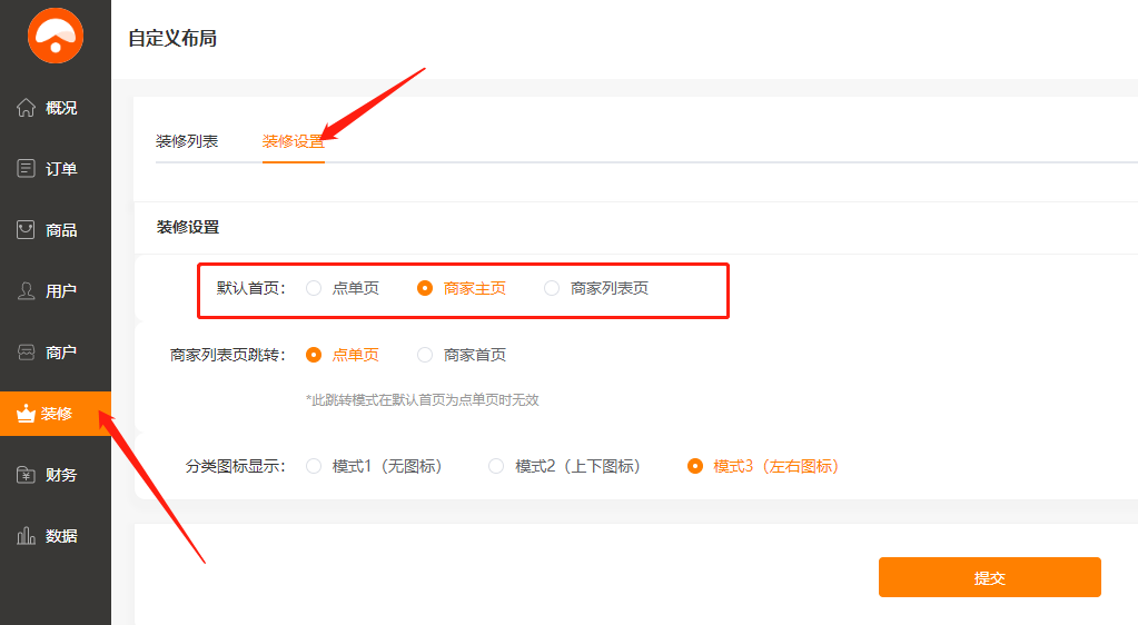 绑定小程序之后可进入到店铺装修页面。可以选择导入系统默认值装修,也可以自己创建页面自定义装修 **路径:后台>>装修**  **装修组件可以自由上下拖动位置**  自定义首页设置: 点单页、商家主页、商家列表页均可作为首页展示 自定义商家列表页跳转链接: 可跳转到商家点单页或者商家主页 自定义点单页左侧分类样式: 1、无图标; 2、图标文字上下排列; 3、图标文字左右排列  **手机端演示**