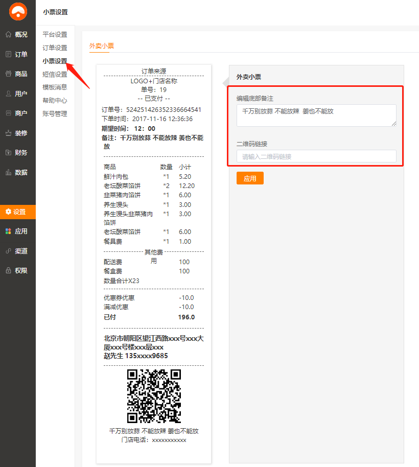 功能路径:后台--财务--收支明细 介绍:可在左边预览小票打印效果,并可在右侧填写底部备注信息和二维码链接,完成后点击应用。