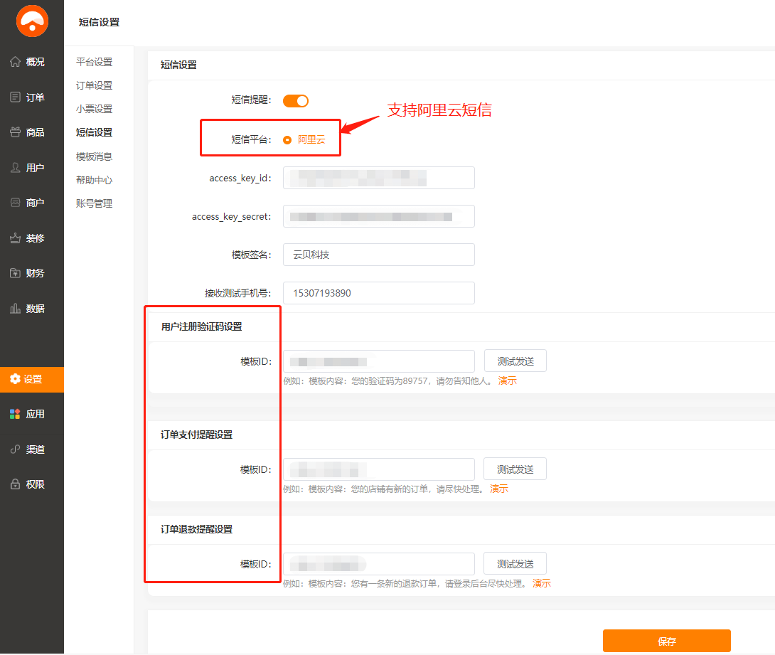 功能路径:后台--设置--短信设置 介绍:可自定义开关短信提醒,目前仅支持阿里云短信。 支持短信提醒的内容有: 1、用户注册验证码; 2、订单支付提醒; 3、订单退款提醒。