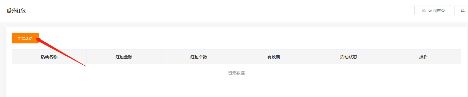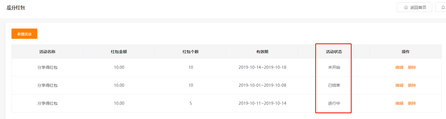 分红包是商家为了引流和吸引顾客的一种营销手段,可以借助好友关系,裂变式获取流量。 新建瓜分红包 操作路径:登录后台->【应用】->【瓜分红包】->【新增活动】   ** ①基本信息** 红包的玩法有两种:随机金额和平均金额,根据店铺需要选择使用; 活动有效期设置不能重复,即两个活动的时间不能重叠和交叉; 按照页面提示填写和完善好其他信息  **②使用条件** 设置触发红包的支付金额,即用户支付多少元自动领取红包  完善好以上信息确认保存或点击保存后发布即可。 活动的状态分为:未开始、已结束、进行中三种状态。