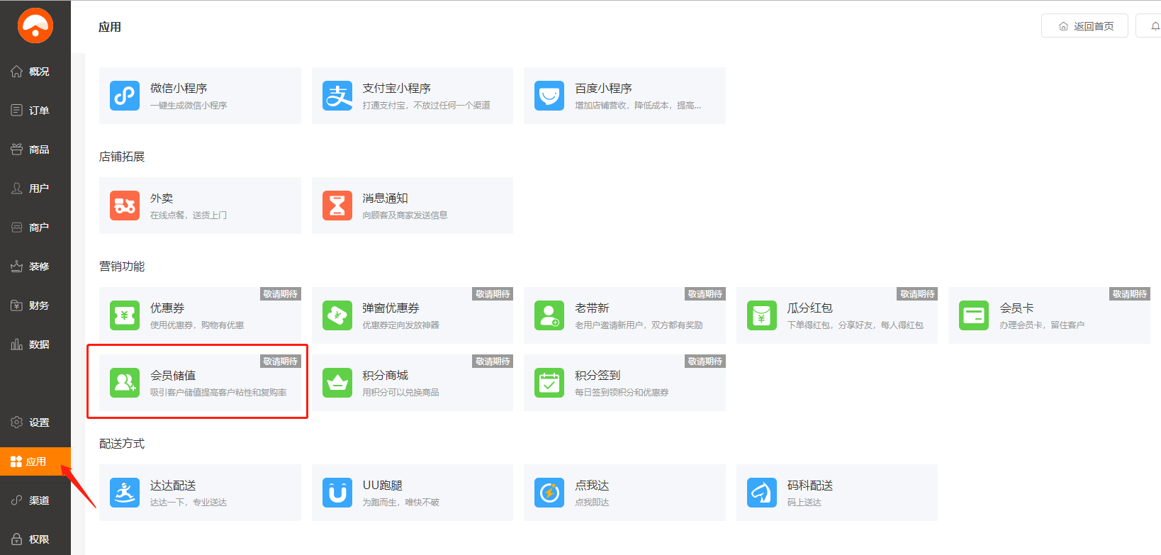 # ▌会员储值功能介绍 【会员储值】是一款可帮助商家提升客户忠诚度、增强会员粘性的营销活动。商家可根据需要创建储值规则,并配置不同的储值营销活动来招募更多的新会员和刺激会员消费。 # ▌功能路径 **操作路径:**打开后台->【应用】->【会员储值】->【储值规则】->【新建储值规则】   # ▌流程介绍 1、设置储值规则 - 储值规则名称:如充100送20 - 储值金额:即充值金额,可设置大于0的整数,建议金额1-5000元 - 优惠活动:充值一般配合营销活动使用,如充值送金额、送积分、送会员(具体到等级);条件可多选。 - 使用须知:一般填写一些储值卡的规则、使用限制等等….  设置好以上内容,保存即可。