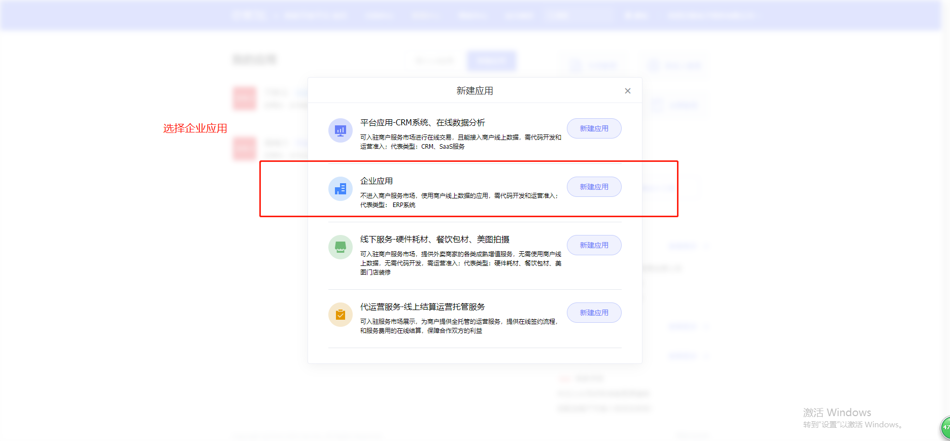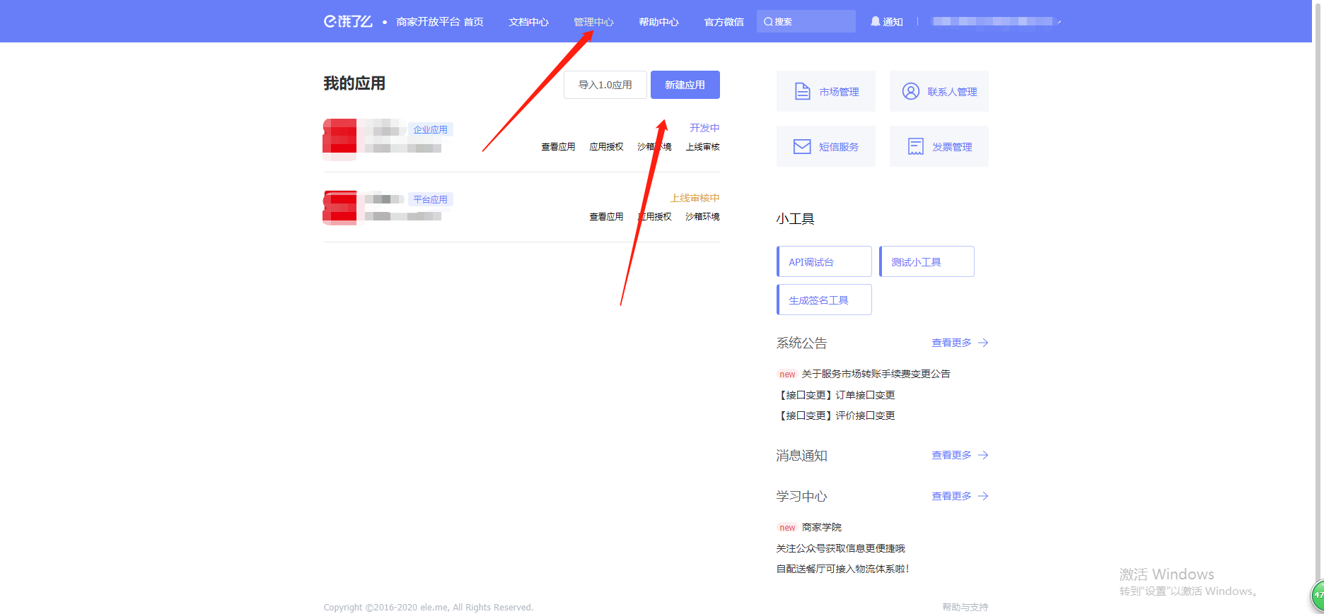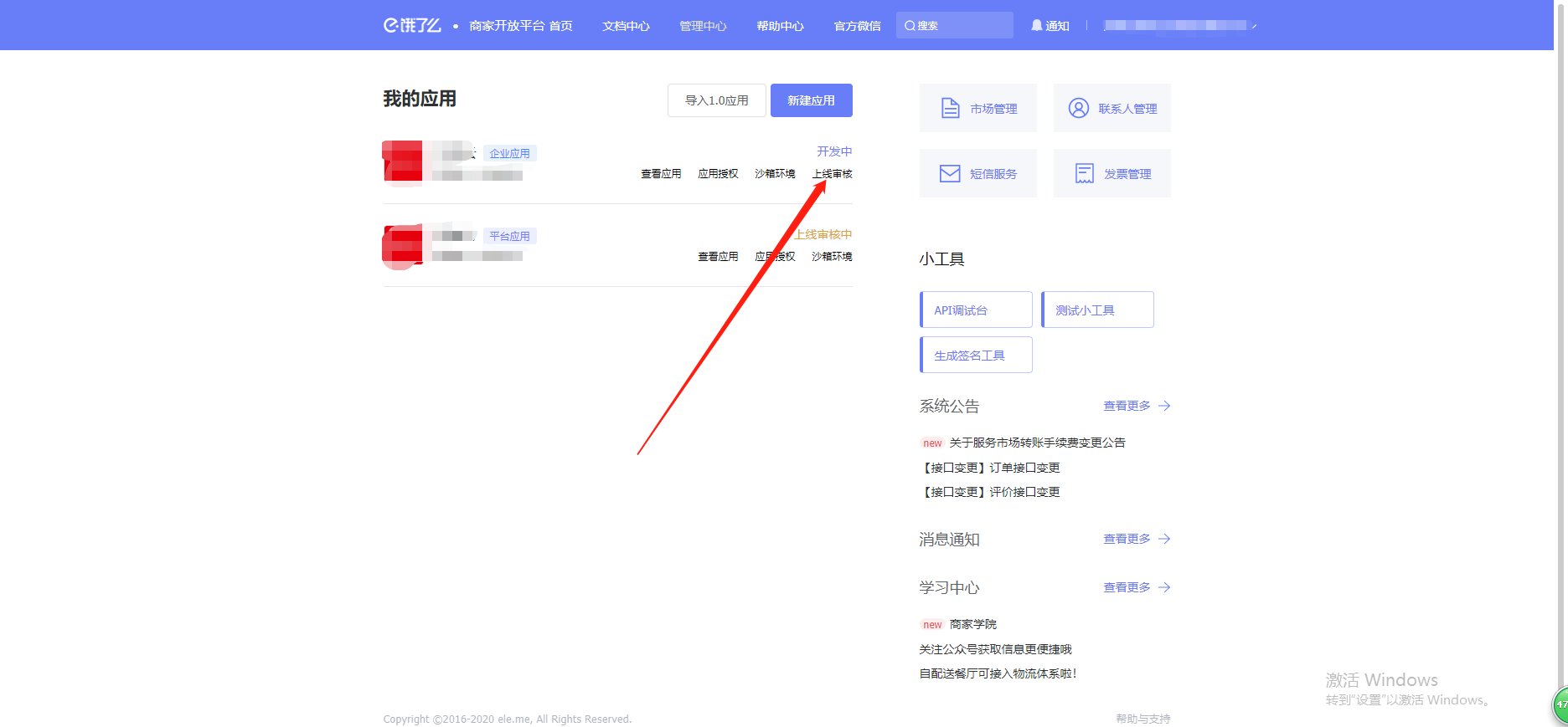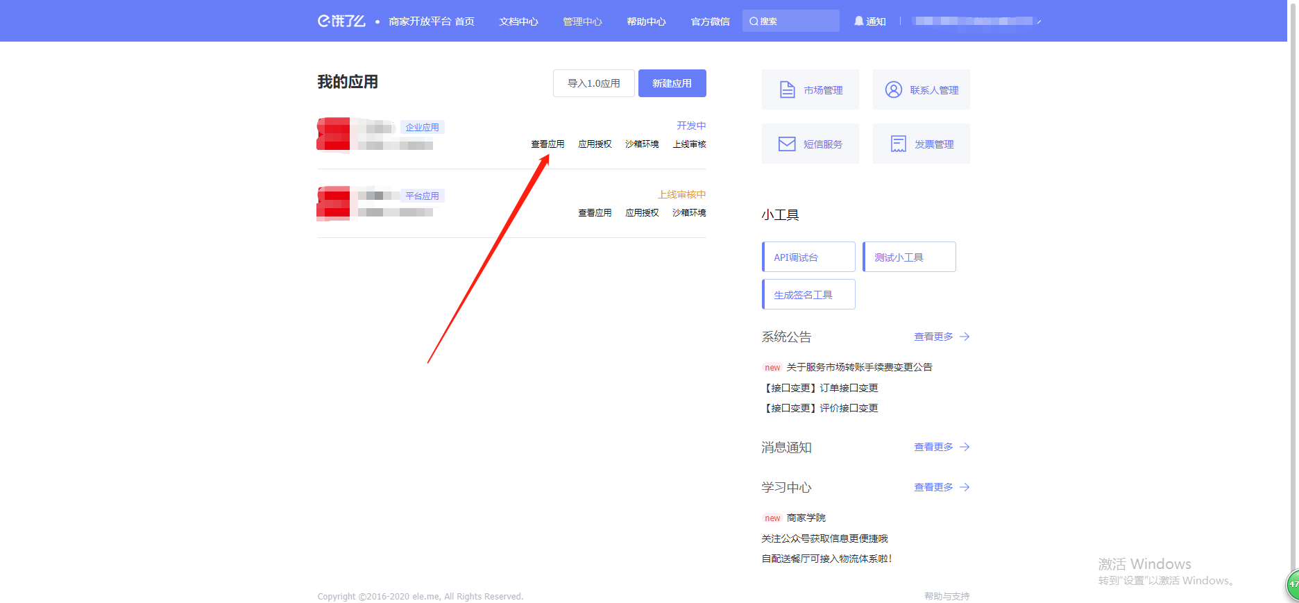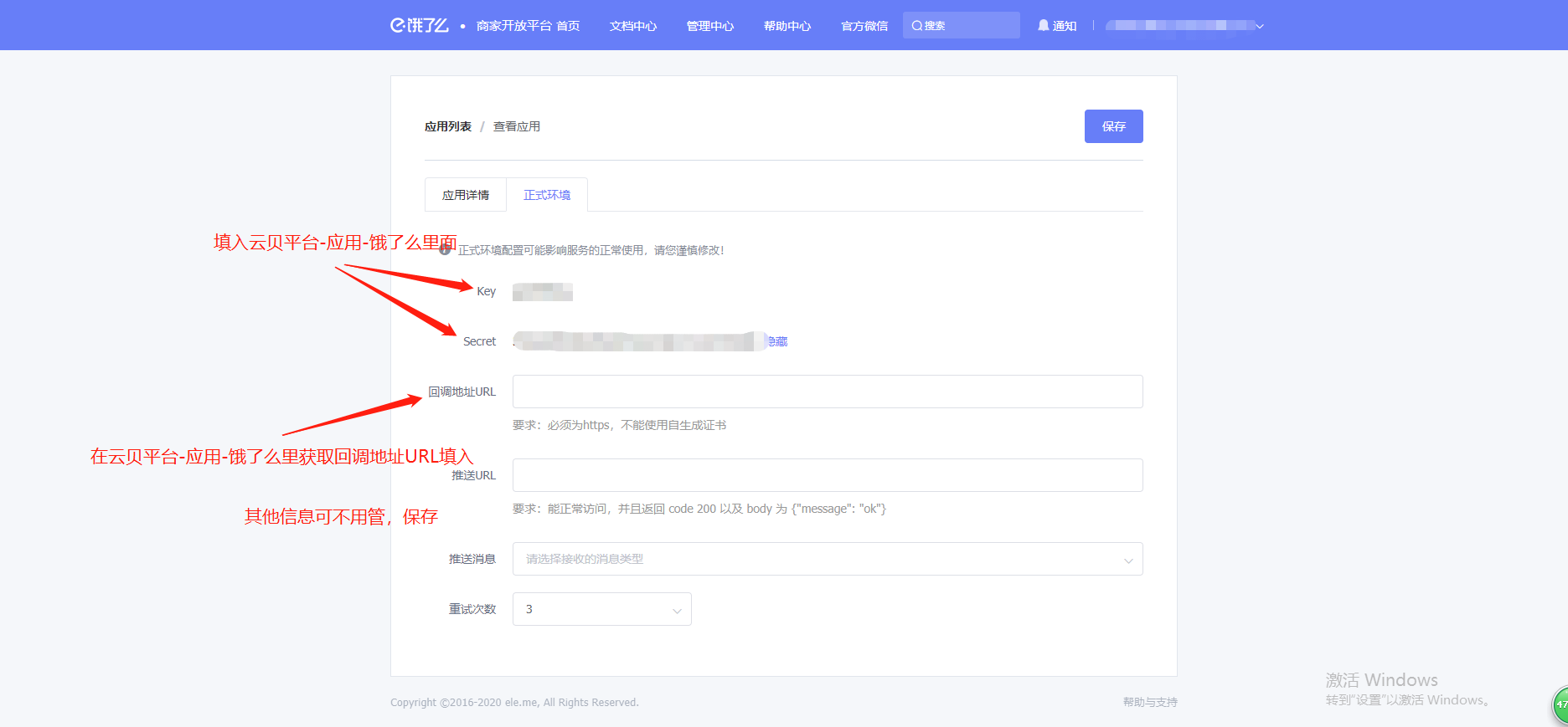 功能路径:进入后台>>应用>>饿了么 介绍:支持对接饿了么商品及商品分类  # 一、进入饿了么开放平台注册账号 :https://open.shop.ele.me/openapi;注册完以后登录饿了么开放平台  # 二、点击管理中心,新建应用, 填写相关信息后保存    类型选择企业应用,应用权限全选,设置完以后保存提交。  点击查看应用,在正式环境里,将key和sercet填写到未来鸟后台应用-饿了么里,然后将后台应用-饿了么里的回调地址URL复制粘贴过来,其他可为空选,具体如下图:  然后保存正式环境设置,重新提交应用审核,等待审核  至此饿了么开放平台的申请注册到此结束 # 三、登录未来餐饮平台-应用 -饿了么填写相关信息  # 四、进入商户管理后台-营销-饿了么 输入饿了么门店id点击授权即可