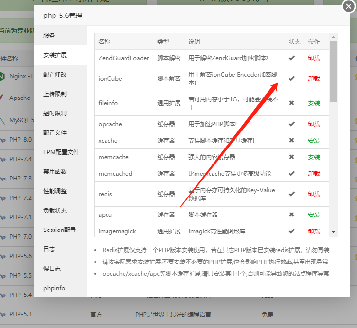 ## 一、登录宝塔面板,查看站点使用的哪个版本的PHP  ## 二、打开软件管理页面,找到对应的PHP版本,点击设置  ## 三、找到安装扩展选项卡 查看ioncube插件是否安装,如果未安装的话,点击安装,然后重启PHP即可。