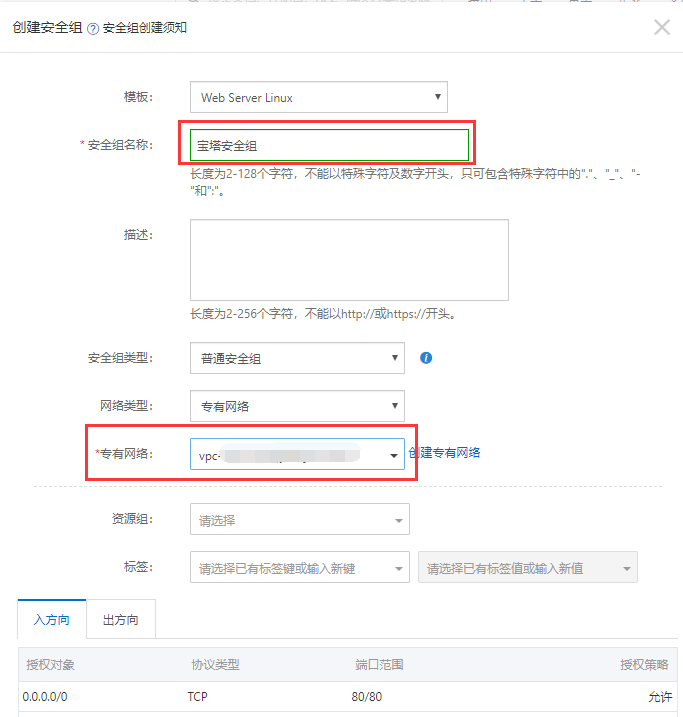 一、登录阿里云控制台,点击左侧菜单【云服务器ECS】  二、在云服务器首页,点击左侧菜单【安全组】  三、这里以新服务器为例,在安全组页面点击【新建安全组】(如果之前有安全组配置,只是增加个别端口,可忽略这一步)  四、填写安全组名称,选择专用网络,点击【确定】按钮  五、点击【立即设置规则】按钮  六、点击【添加安全组规则】  七、以8282端口为例,在商品范围中填写8282/8282,授权对象填写0.0.0.0/0,点击【确定】按钮。 开启其它端口同理,如果安装宝塔面板,需要开启22、80、443、888、3306、8888、39000/40000等常用端口  八、返回实例列表,找到对应的服务器,点击【更多】-【网络与安全组】-【加入安全组】  九、在弹出的窗口中选择刚创建好的【宝塔安全组】,点击【确定】按钮 然后重启服务器即可