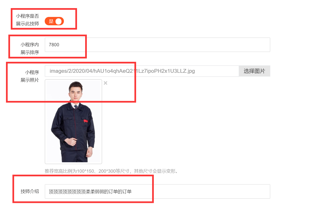 扫描二维码查看效果 本功能仅展示技师信息,不能直接选技师下单,如果介意的话,不用开启此功能。  ## 一、 小程序端技师可上传照片证书和自我介绍等 ## 二、未来鸟引擎后台,技师管理 点击技师编辑可以查看技师资料  1、 是否展示技师开关(技师开关打开并且技师状态为工作中可以在小程序中展示) 2、 排序越高的在小程序中展示越靠前 3、 照片比例为1:1.5 比如200*300这种 4、 技师介绍会在小程序展示(技师介绍可以技师本人加盟是填写,也可以后台修改)