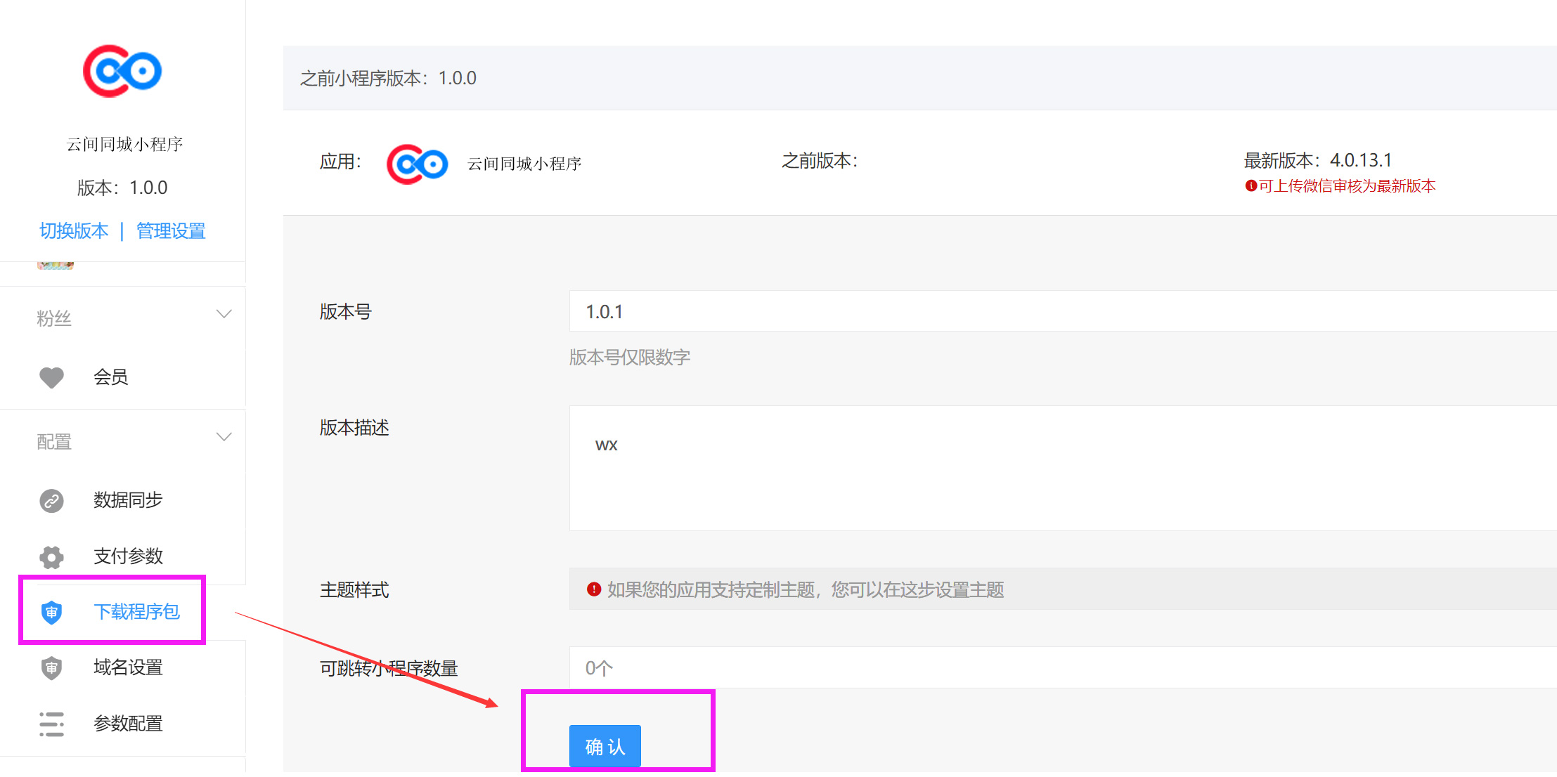 上门服务小程序更新方法 一、更新通知 二、打开自己的未来鸟引擎站点,点击右上角“控制台”  三、点击“应用管理”  四、找到“家政上门服务小程序”,点击升级  五、更新完成后,进入小程序平台  六、提交版本审核,根据未来鸟引擎不同的版本,此处可能显示“下载程序包”或者“上传微信审核”  七、管理员扫描二维码后,进入官方小程序后台,版本管理,提交审核,审核通过后,发布版本。