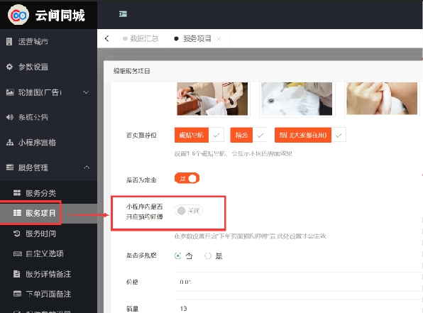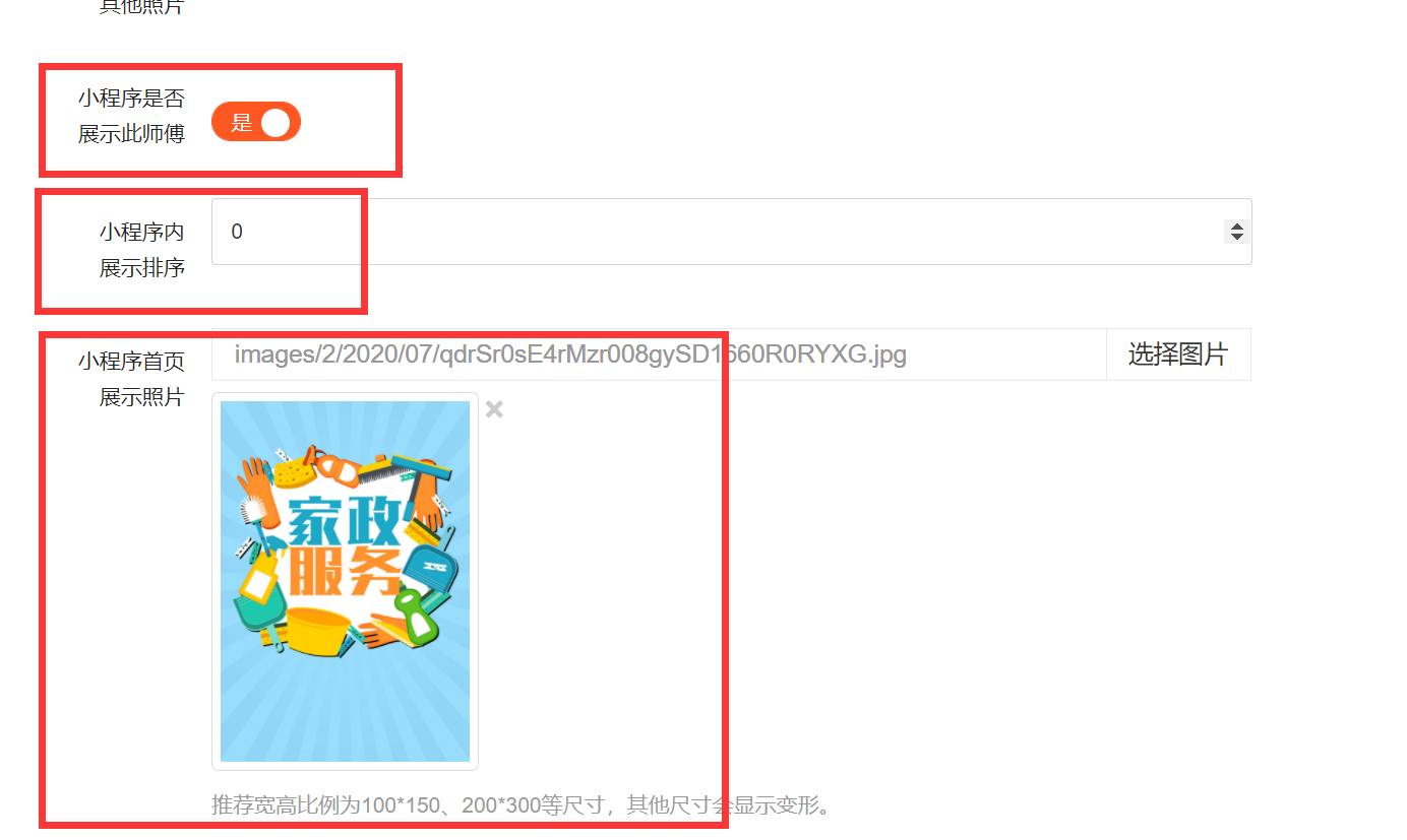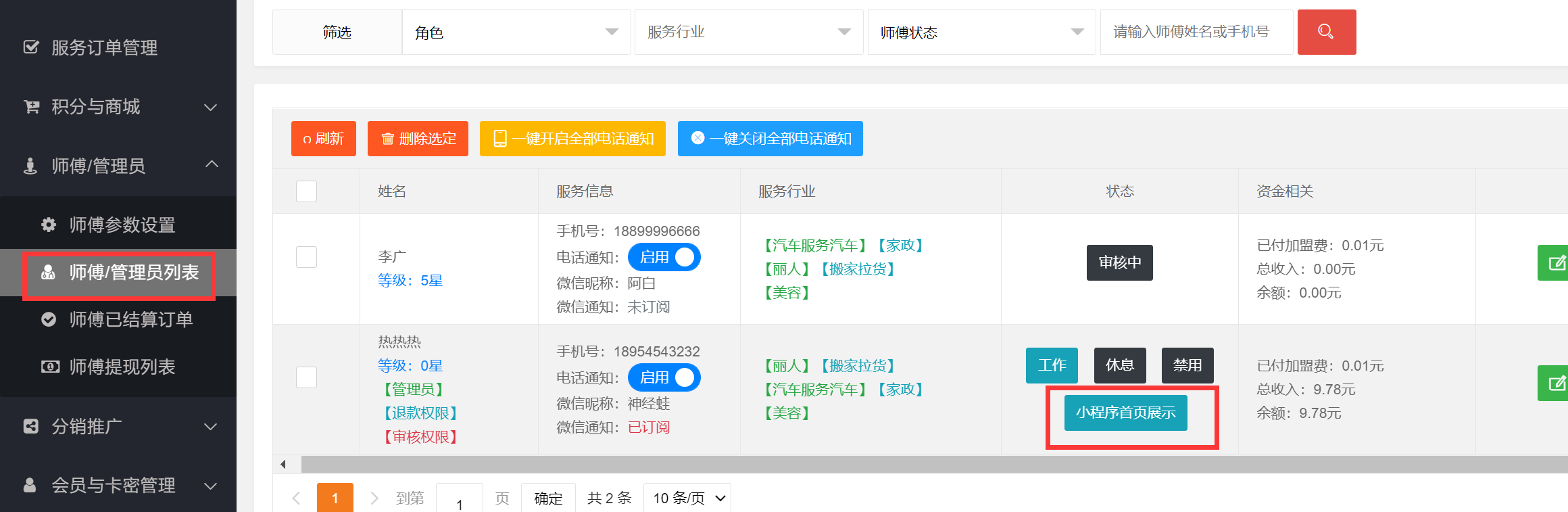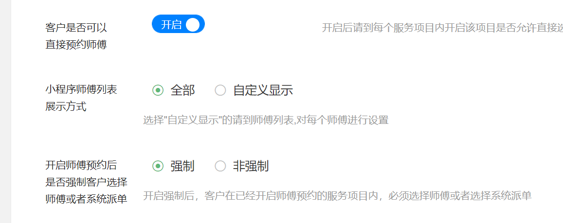 开启直接预约师傅下单 版本升级到4.2.18以上 1) 参数设置开启功能并设置师傅列表展示方式和是否强制客户选择师傅  开启后可到每个服务项目内设置 当前服务是否开启直接预约师傅  2) 进入后台 技师/管理员列表, 选择师傅开启小程序首页展示(师傅要进入过一次师傅中心)  3) 编辑师傅 设置小程序首页展示照片 没有的话小程序内就展示师傅头像