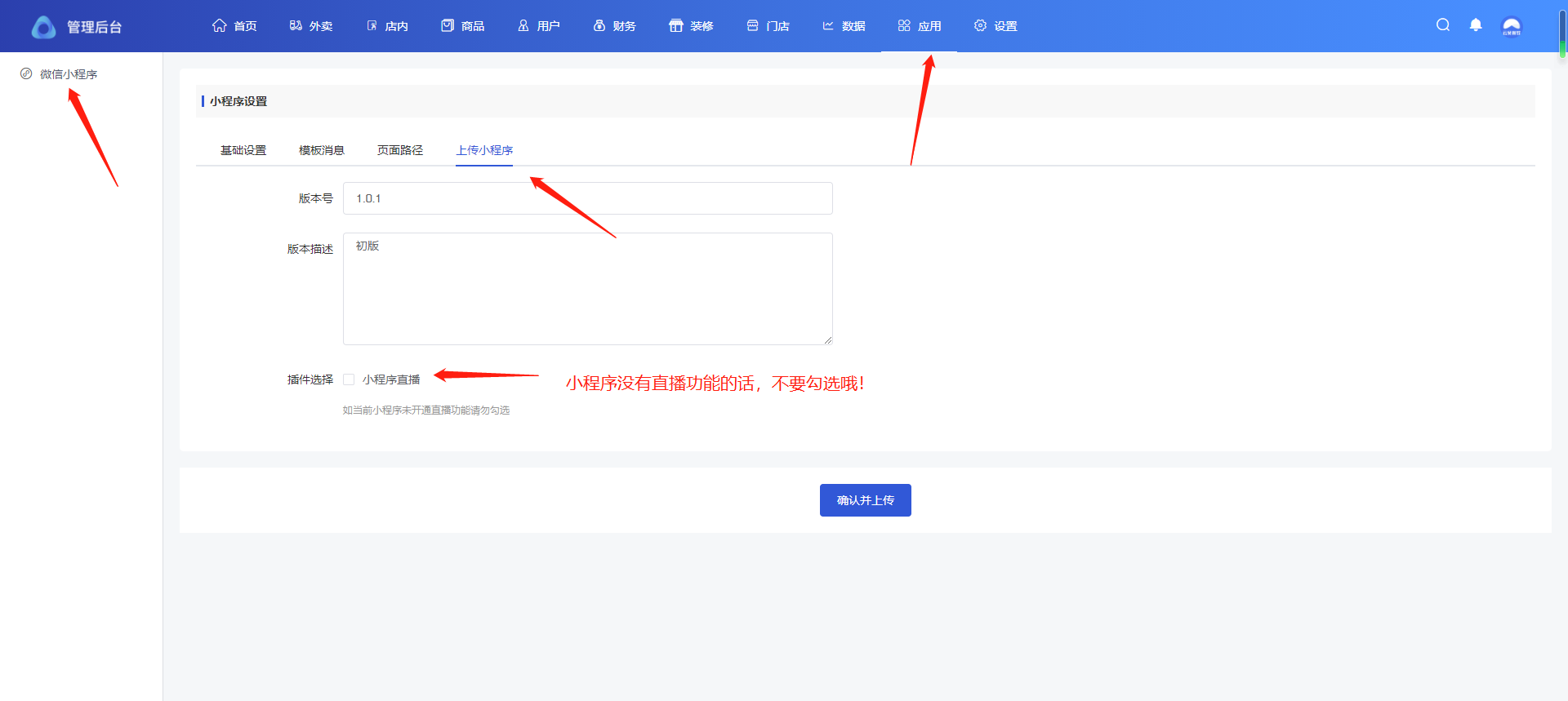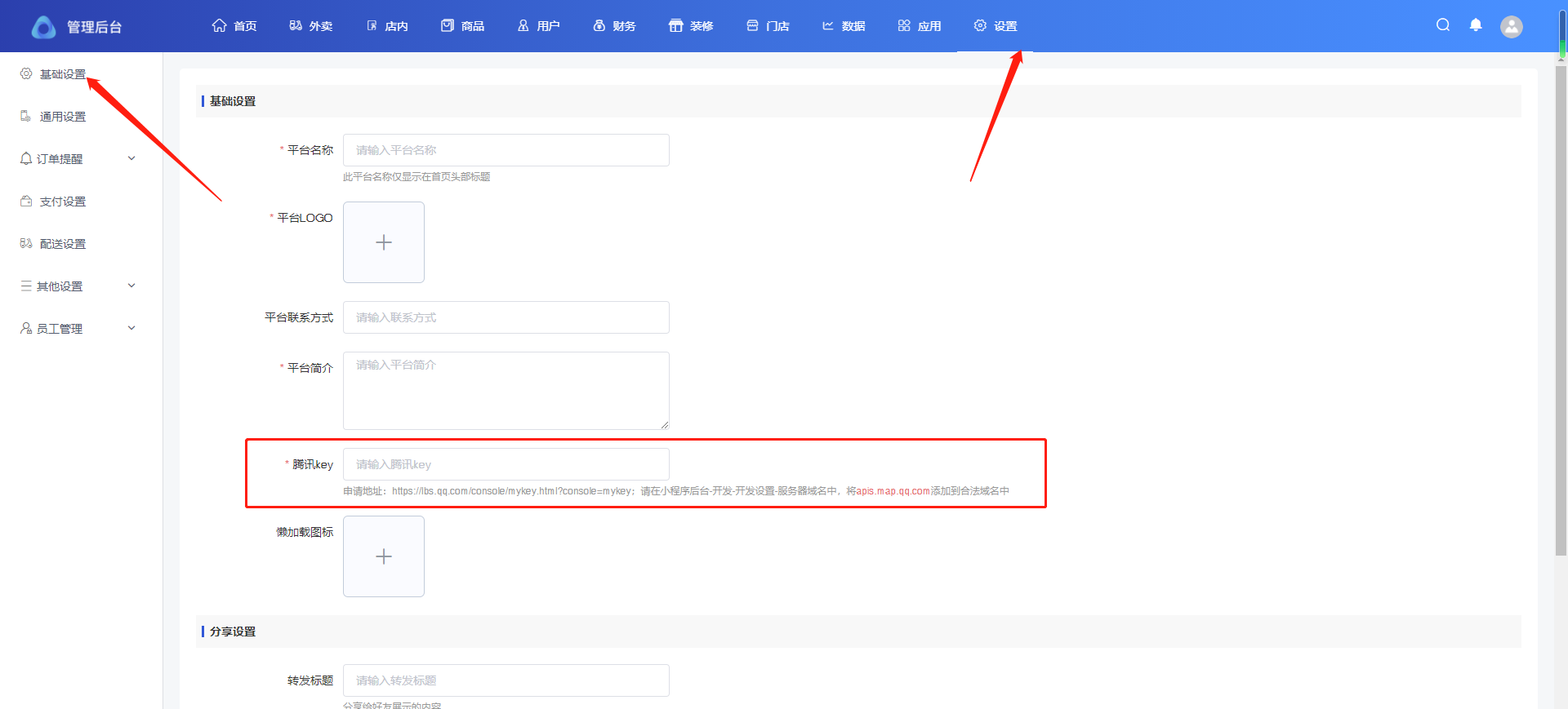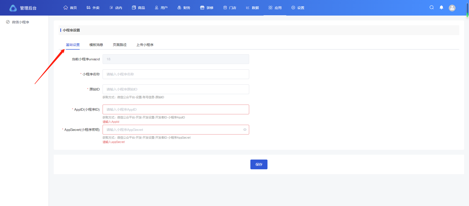 ## 如何发布微信小程序 1.先配置微信程序基础信息 路径:应用-微信小程序-基础信息   **2. 配置平台信息 注意:腾讯地图key必须按照要求申请**, 路径:设置-基础设置  3.设置商户信息 提示:门店下单不显示内容或价格显示错误,一般都是商户信息没有设置好 路径:首页-商户信息  4.设置外卖设置 至少开启一种配送支持才能下单 主店路径:外卖-外卖设置  子门店路径:子门店管理后台-订单-订单设置   5.设置装修页 不想自己设置的话,不用添加装修页,直接预览小程序会自动生成默认模板哦 路径:装修(个人中心和首页都需要添加一个)  注意:首页装修页要设置一下底部导航,不设置首页链接的话,底部就没有导航哦  6. 添加商品和分类 如后台没有商品,点单页会无法正常加载,注意:先添加商品分类,完善商品规格、属性、加料、单位等信息,再开始添加商品 路径:商品-外卖商品  注意:添加商品时,先保存好基础信息再保存其他信息,这两个必须要分开保存  7.上传小程序版本 路径:应用-微信小程序-上传小程序  ## 微信小程序公众平台配置 配置小程序服务器域名:将您的后台域名配置到五个合法域名里面;将腾讯地图域名“https://apis.map.qq.com”配置到第一个“request合法域名”里面 路径:开发-开发管理-开发设置-服务器域名  2.上传小程序版本提交审核 路径:管理-版本管理  ## 等待小程序审核通过之后,就可以发布运营啦!