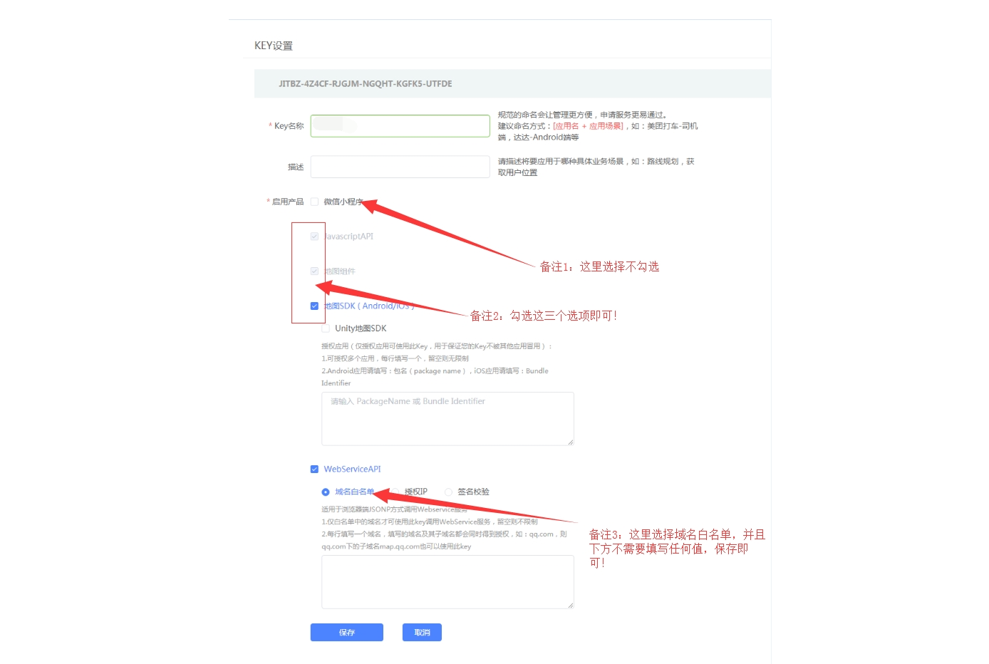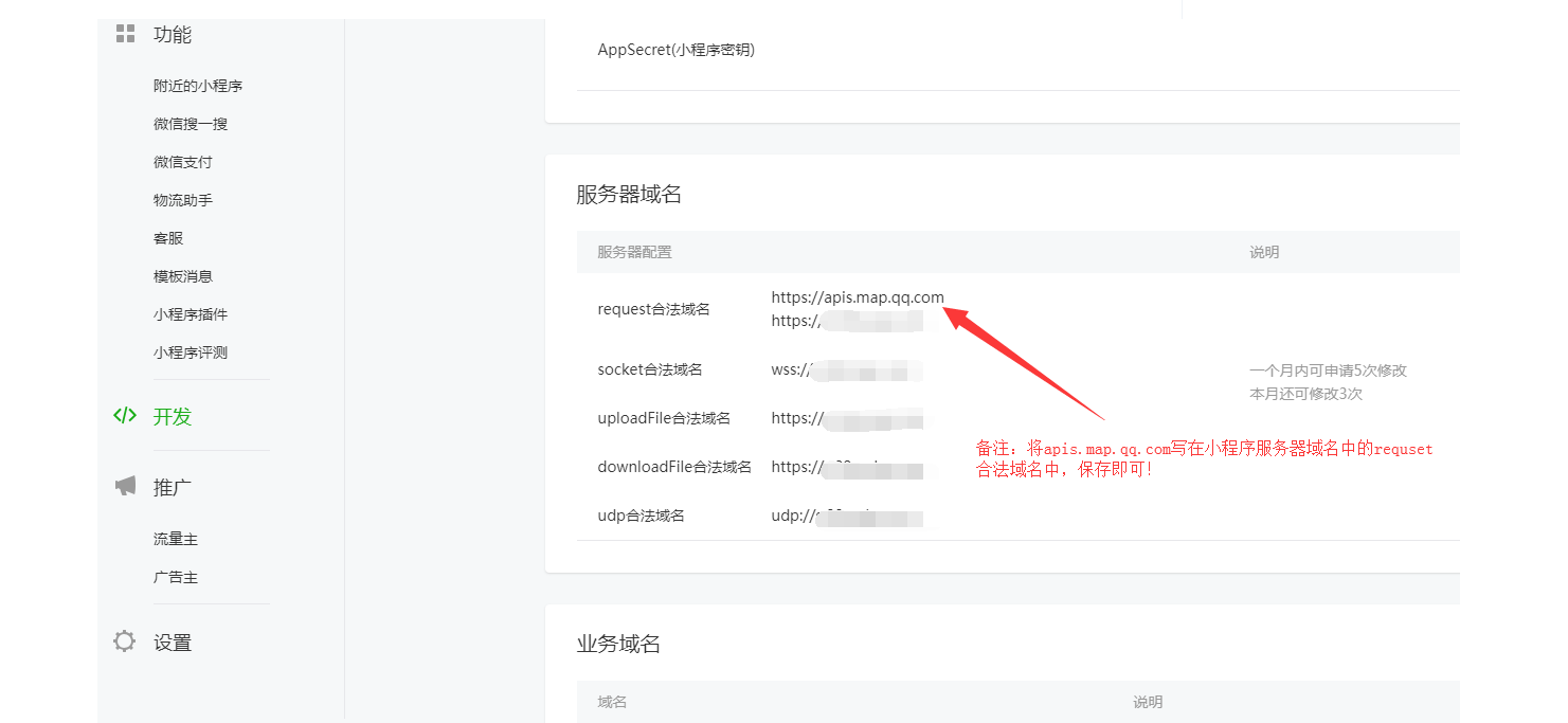 在用户端添加地址提示地址解析异常,获取城市失败解决方法  一般出现这个问题,是因为腾讯key设置有问题或者没有将apis.map.qq.com添加到小程序中的合法域名中 1、检查腾讯key有没有配置好以及申请的选项是否与我们的提示的保持一致,腾讯key申请地址:https://lbs.qq.com/console/mykey.html?console=mykey**   2、检查小程序后台,页面,有没有将apis.map.qq.com添加到小程序中的合法域名中