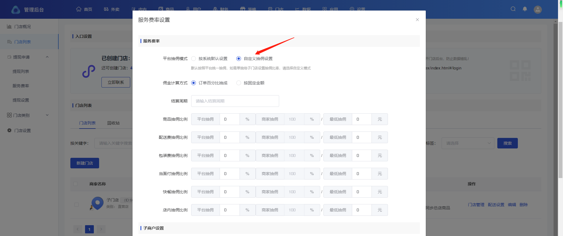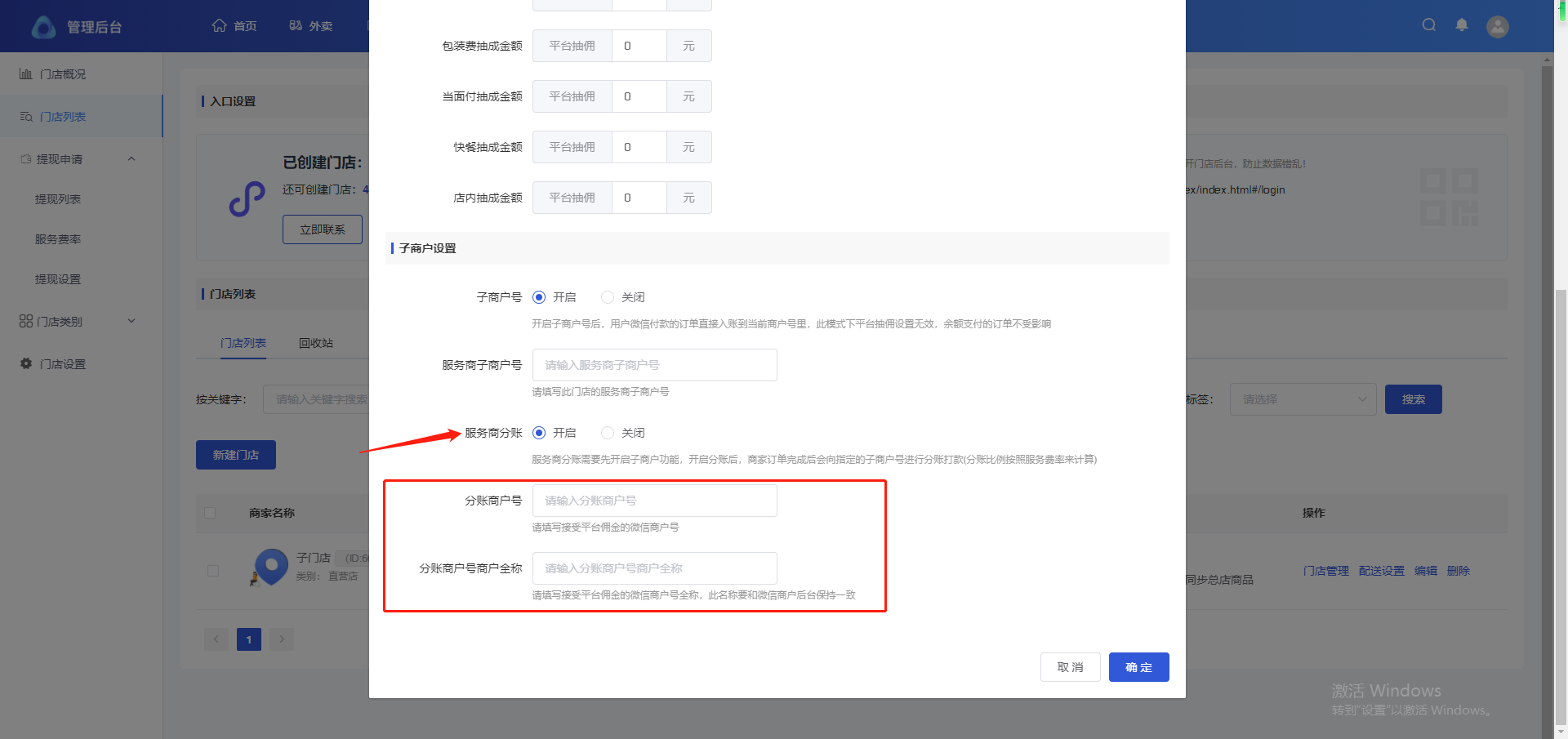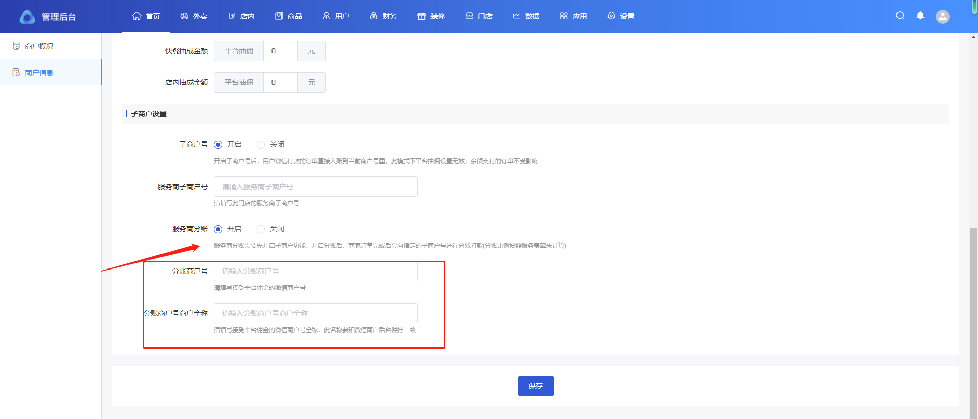 ## 分账服务费率设置 #### 主店服务费率 路径:首页-商户信息-服务费率设置 添加分账接收方,建议为普通商户号  设置服务费率 设置自定义抽佣,按照当前页面设置比例抽佣  设置系统默,按照门店-服务费率设置抽佣  子门店服务费率 路径:门店-门店列表-抽佣比例 添加分账接收方,建议为普通商户号   设置服务费率 设置自定义抽佣,按照当前页面设置比例抽佣  设置系统默,按照门店-服务费率设置抽佣