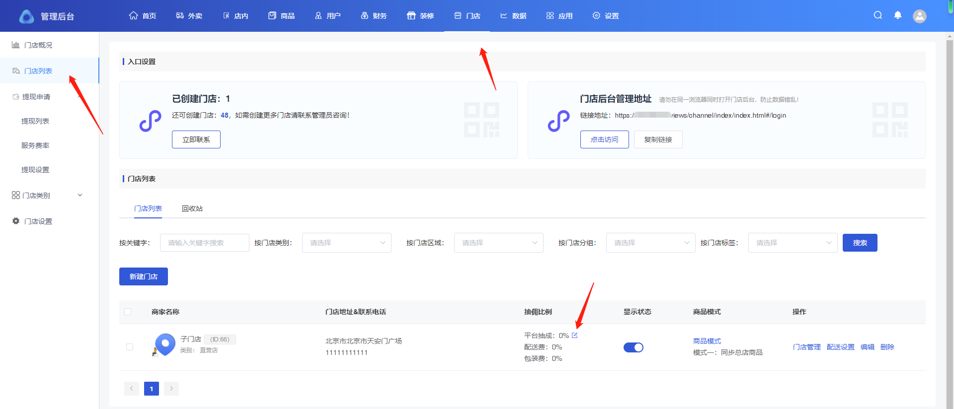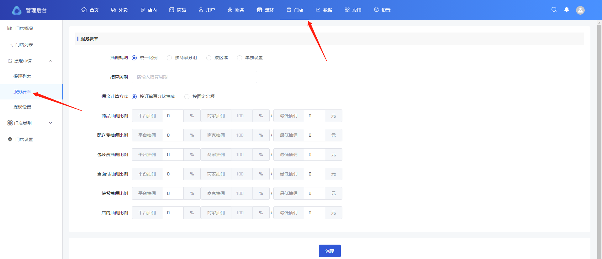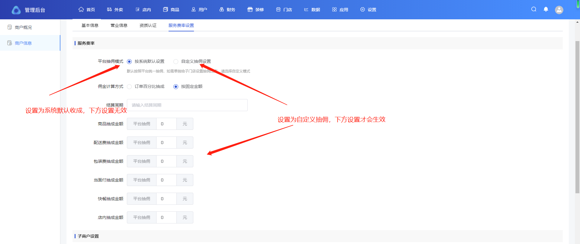 ## 分账服务费率设置 #### 主店服务费率 路径:首页-商户信息-服务费率设置 添加分账接收方,建议为普通商户号  设置服务费率 设置自定义抽佣,按照当前页面设置比例抽佣  设置系统默,按照门店-服务费率设置抽佣  子门店服务费率 路径:门店-门店列表-抽佣比例 添加分账接收方,建议为普通商户号   设置服务费率 设置自定义抽佣,按照当前页面设置比例抽佣  设置系统默,按照门店-服务费率设置抽佣