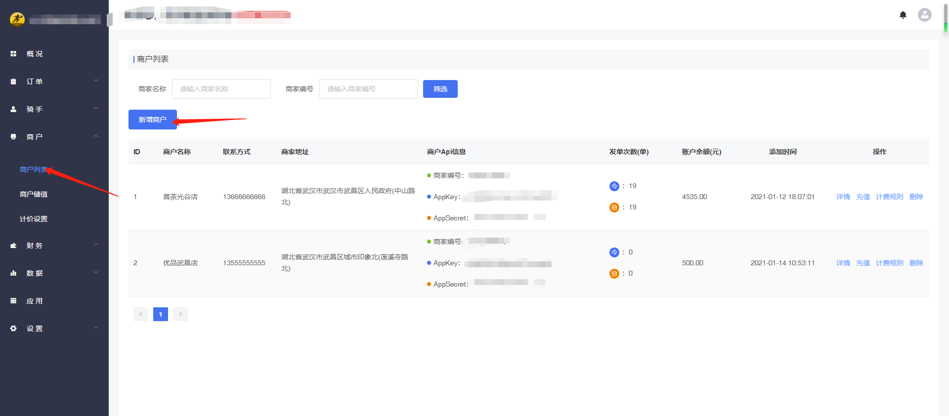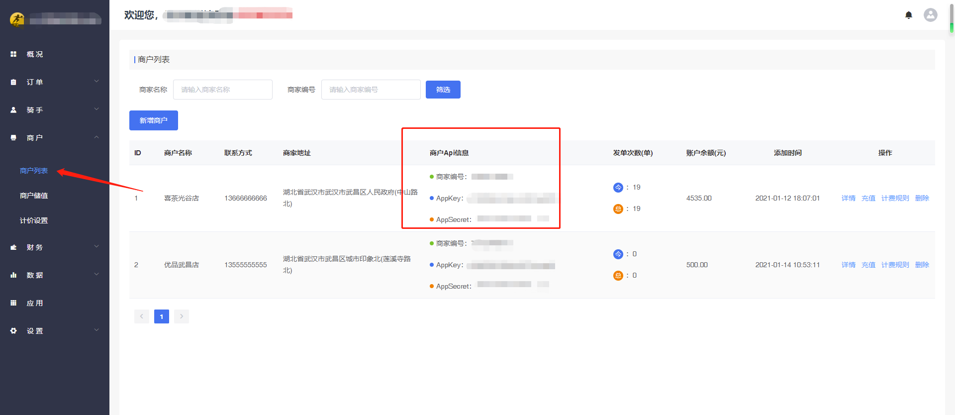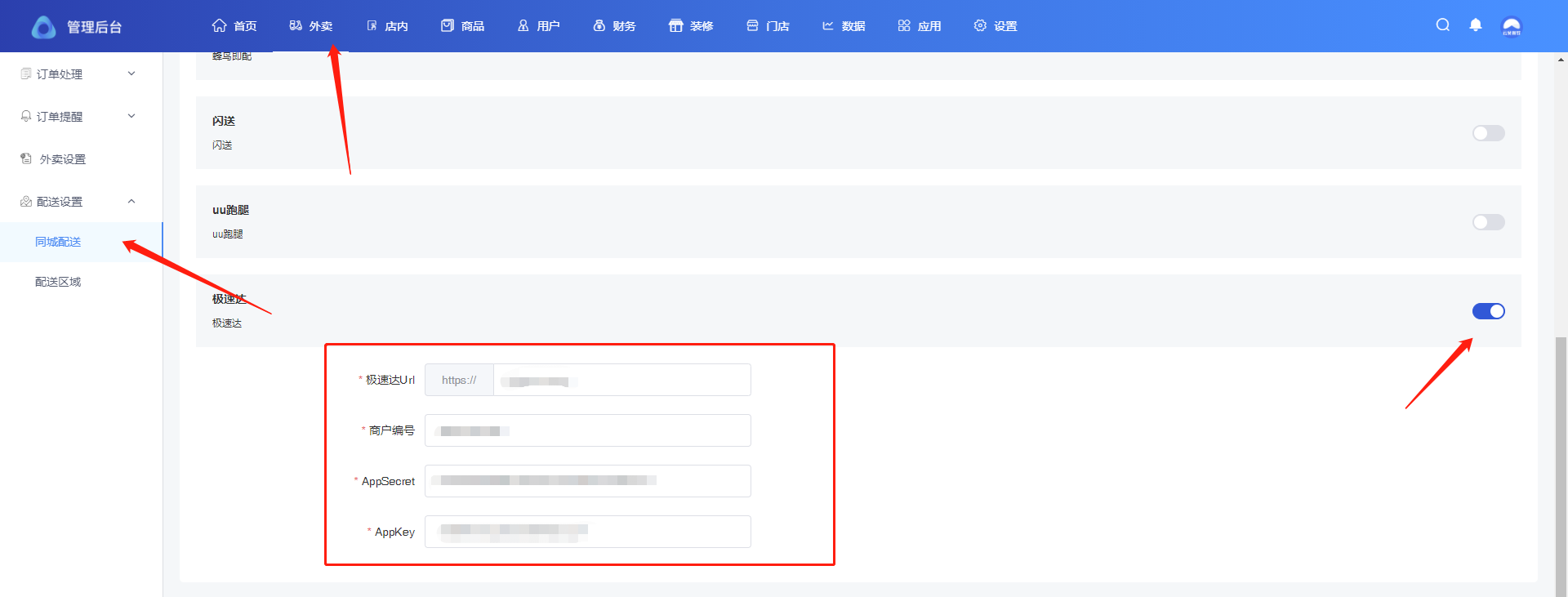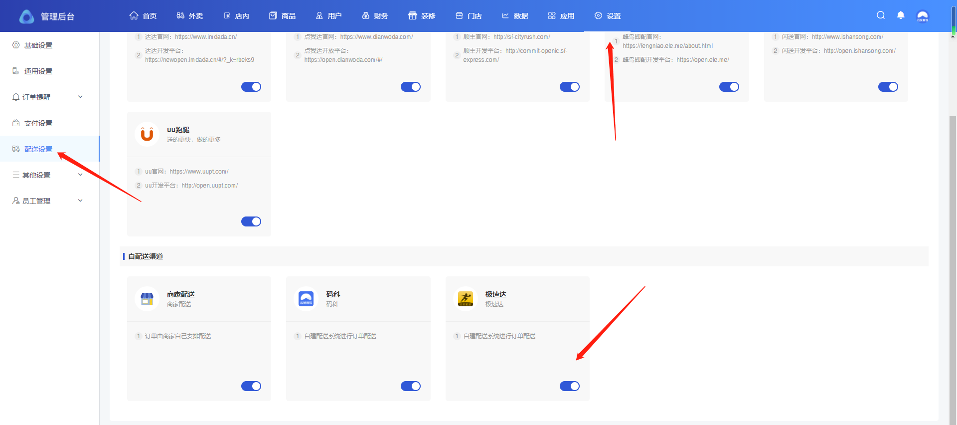 ## 云贝对接教程 #### 第一步:在云贝后台配置 开启云贝配送方式,路径:设置-配送设置  主店配置路径:外卖-配送设置-同城配送  子门店配置路径:门店-门店列表-配送设置  填写在云贝后台的商家编号、appkey和密钥  #### 第二步:在云贝后台配置 配置路径:进入云贝后台->商户列表->添加商户  这样就对接完成啦! 云标题和logo可以在后台更改 独立版更改路径:平台-编辑-其他设置   未来鸟引擎版更改路径:权限-小程序-编辑