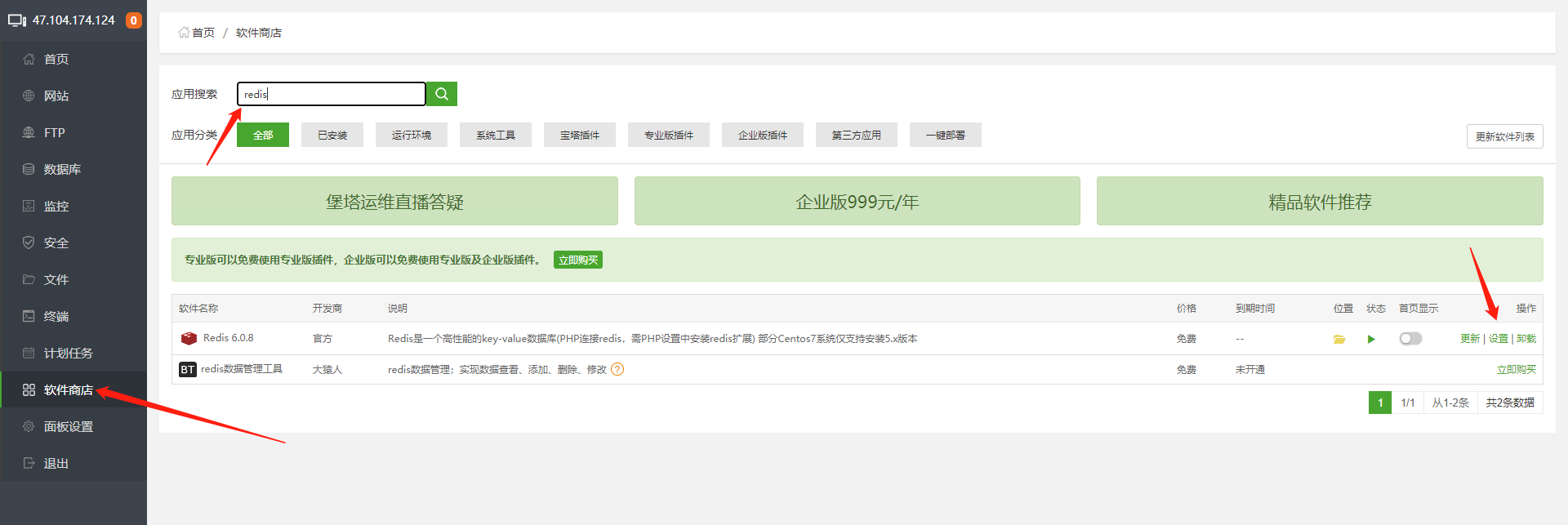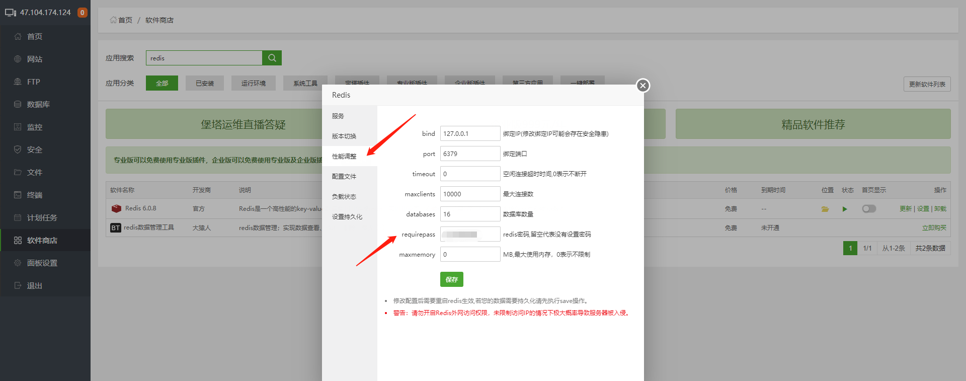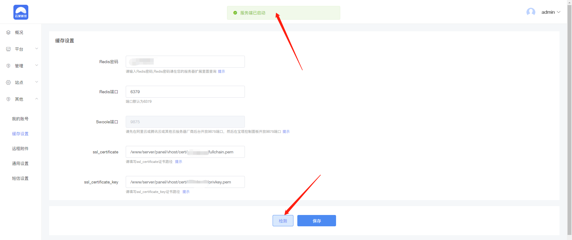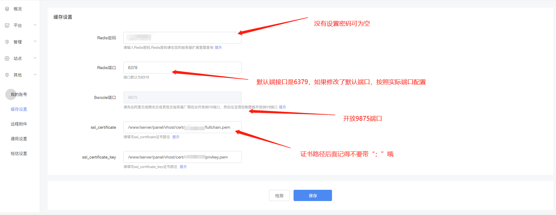 1.软件商店找到网站对应的php版本,点击设置(确保php版本为7.0及以上)  2.安装redis扩展和swoole扩展(redis默认是没有密码的,如要设置请参考下面设置教程)  3.登陆阿里云,在服务器实例安全组规则中手动添加一条9875端口,操作如图所示:  4.如果是宝塔用户,需要在宝塔后台安全里面放行9875端口  5.配置https证书位置   6.在宝塔项目根目录运行sh openVoice.sh命令 开启语音提醒服务端服务   独立版  未来鸟引擎版    7.检测服务端是否开启  ## redis密码设置 软件商店搜索redis,点击设置  设置密码之后必须要重启才能生效哦!