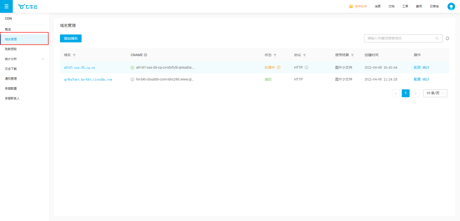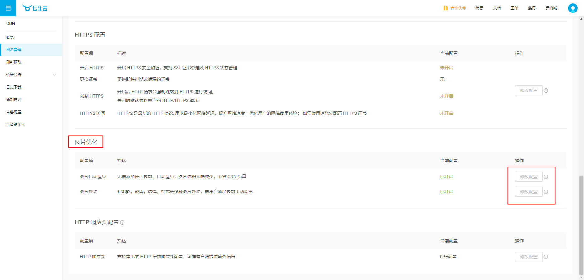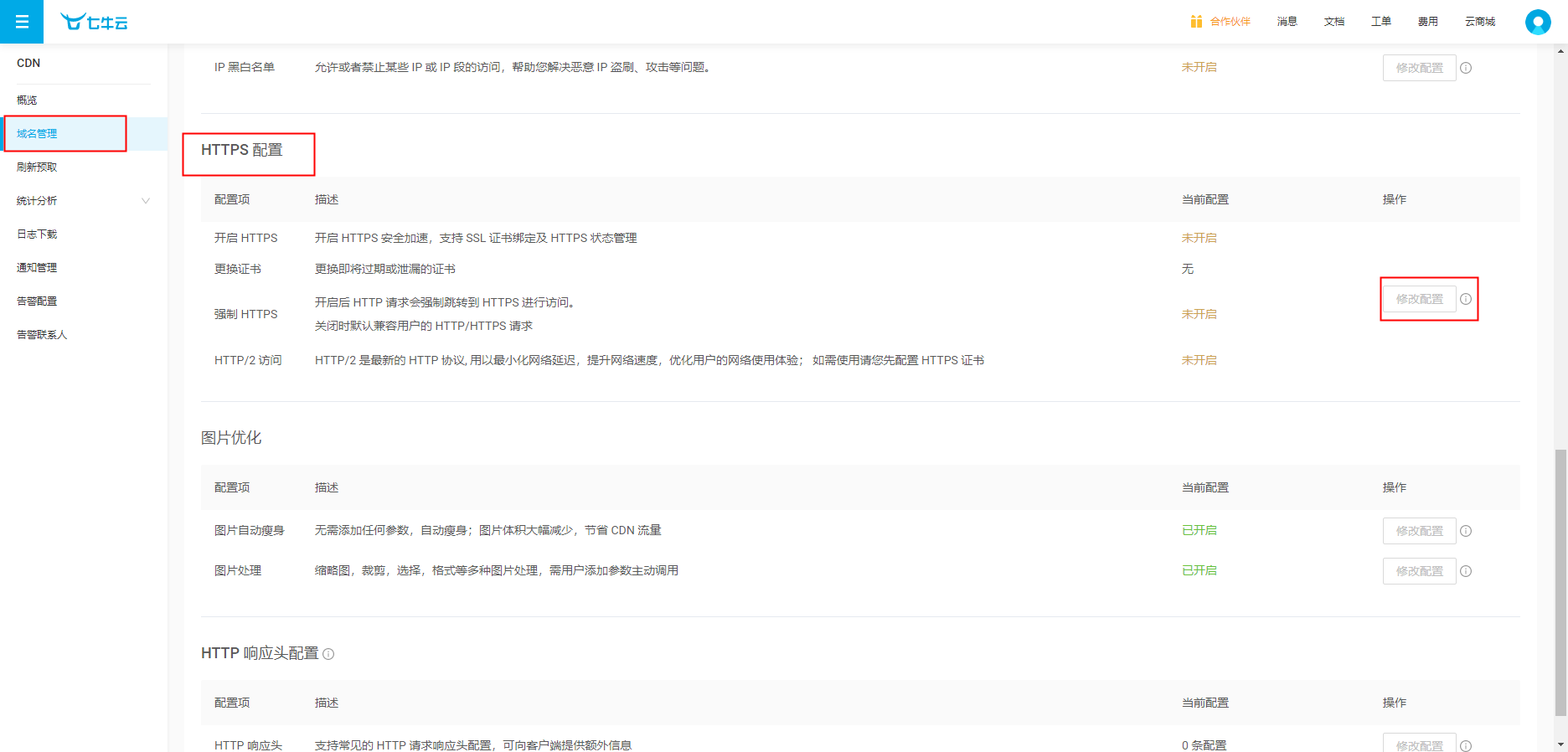 ## 1.登录DNSPod _1617939586.jpg) ## 2.点击DNS解析,进入我的域名  ## 3.进入后点击添加记录  ## 4.添加主机记录,记录类型:(CNME:别名)记录值(客户提供)权重(10),点击确定  ## 5.登录七牛云,点击CDN加速  ## 6.点击域名管理,配置完成后进入配置页面  ## 7.点击HTTPS配置,开启全部配置,  ## 8.HTTPS配置完成后,点击图片配置,关闭配置即可