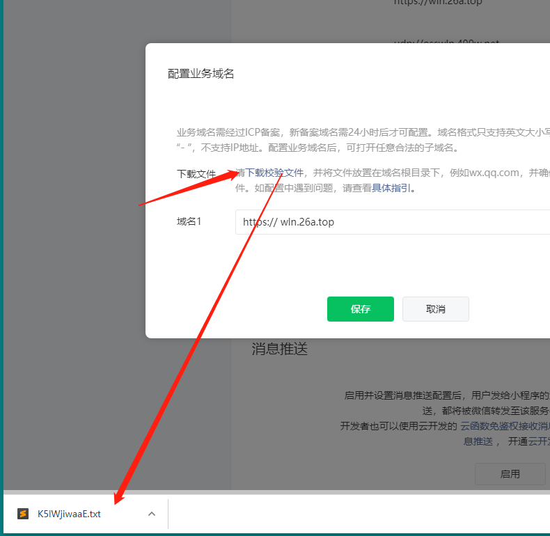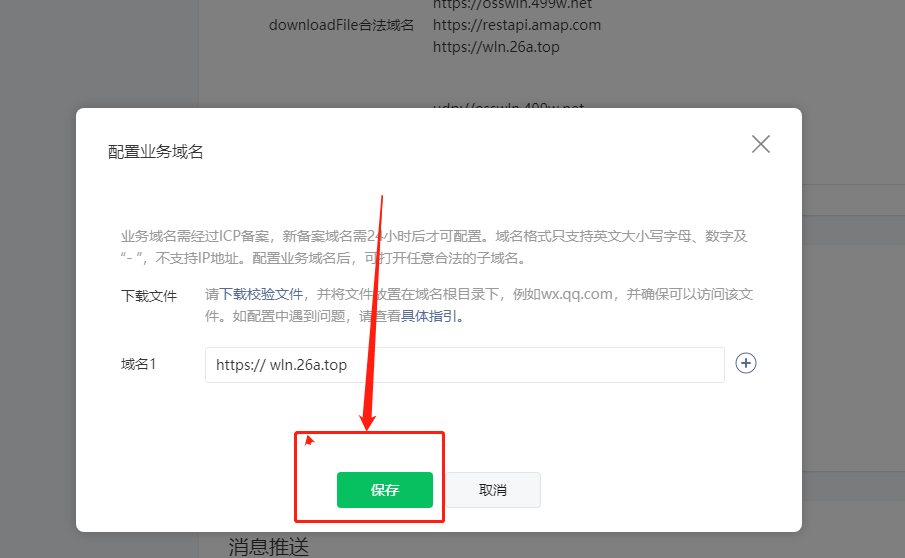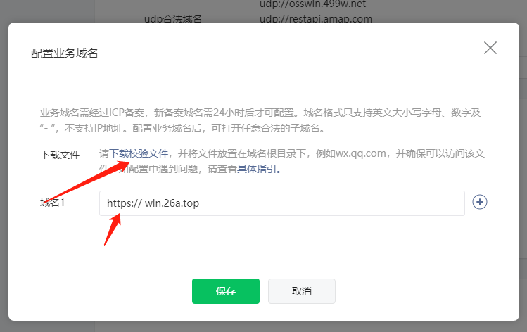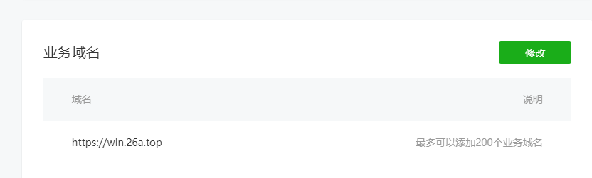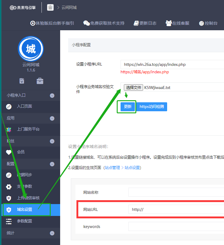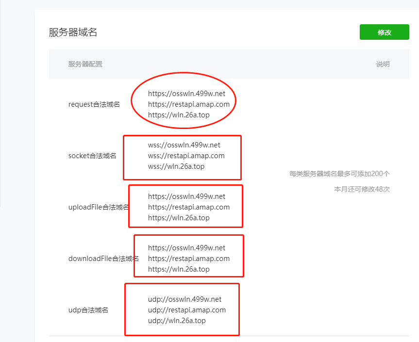 ## 一。服务域名和业务域名的添加 #### 1.服务器域名的添加 官方小程序后台( https://mp.weixin.qq.com/ ) →开发里面 → 开发设置 → 服务器域名 业务域名必须设置, 开启客服消息的话推送消息请不要开启 == 请务必添加以下3个域名为服务器域名 == ```cpp wln.26a.top restapi.amap.com osswln.499w.net ``` 第一个是未来鸟引擎的服务器域名 第二个是高德地图的服务器域名 第三个未来鸟引擎的OSS远程储存域名 (如果不添加高德地图的服务器域名技师将无法抢单,如不添加oss域名,分销商专属推广海报将不能显示) 如下图进行添加  #### 2,添加业务域名 把 https://wln.26a.top/ 添加到业务域名中  A.下载效验文件  B.把效验文件上传到未来鸟引擎后台,然后点击更新  C.返回官方小程序后台,点击保存  保存成功后的样子  请务必添加业务域名,如果不添加,技师端和管理端部分功能将会失效