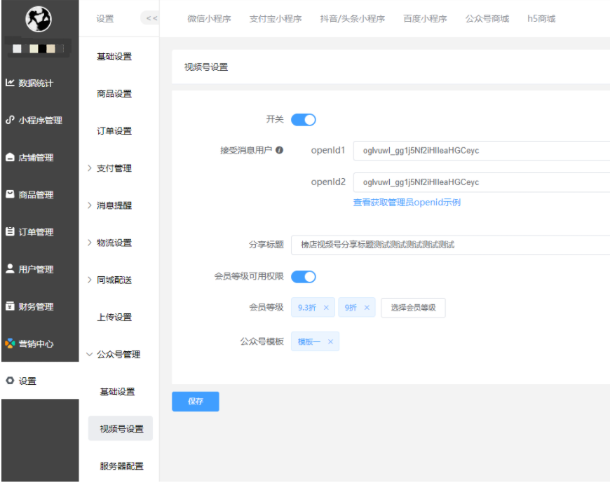 1.需要认证好的服务号,并且配置好服务回调,1天只能生成1000条链接,建议让自己的推广会员才能使用,若图文超过10W条,自己到公众号后台删减下 第一步 配置好公众号参数  第二步 配置视频号参数:需要配置2个用户openid(根据示例教程获取)  第三步 复制服务器配置参数到公众号后台,记得必须保存当前页面     然后打开你的视频号 将链接放在你发的视频下面的扩展链接里面 其他用户打开公众号文章,可以跳转到对应的小程序里面,并且在登陆之后可以绑定上下级关系