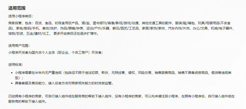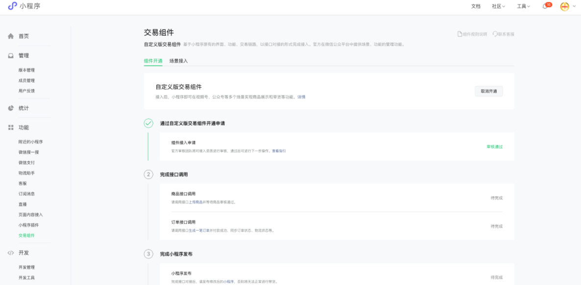 ### 关于自定义交易组件  ==首先,商家需要在微信后台申请自定义版交易组件权限,申请成功后,可以将小程序关联至对应视频号,并在视频号带货直播中使用。==  选择自定义版交易组件,并申请开通功能,进入审核流程。商家也可以通过调用申请接入的接口申请开通功能,申请并审核通过后会看到下面的界面。   若申请开通显示不在白名单,可以厂商填写内测表格 https://wj.qq.com/s2/7722332/ea93/ 其次,接入小程序的视频号要求是企业认证的视频号,且视频号认证主体和微信小程序认证主体一致,或者视频号的管理员和小程序的管理员一致。 若使用了第三方授权小程序方式,请在三方勾选自定义交易组件权限,然后重新授权小程序; 当交易组件开通之后, 首先在我们后台上传商品审核:   审核通过之后,进入微信小程序下单,必须用微信支付,任意商品下单就行 即可完成接口调用 完成之后可以通过企业视频号-我的商店进入  其他用户进入微信视频号主页,可以看到“商店”入口,点击进入,就能直接跳转到通过榜店商城系统发布的小程序。  开启视频号直播时,直播页面底部可显示商品图标,用户点击“商品”,便能直接进入小程序进行下单购买。 在用户进入小程序购物的同时,直播窗口会缩小并悬浮于右下角,用户可以一边抢购,一边继续看直播。  借助视频号直播直接跳转小程序的功能,商家可以在视频号直播中,让用户实现即看即买,缩短交易路径,一站式转化。