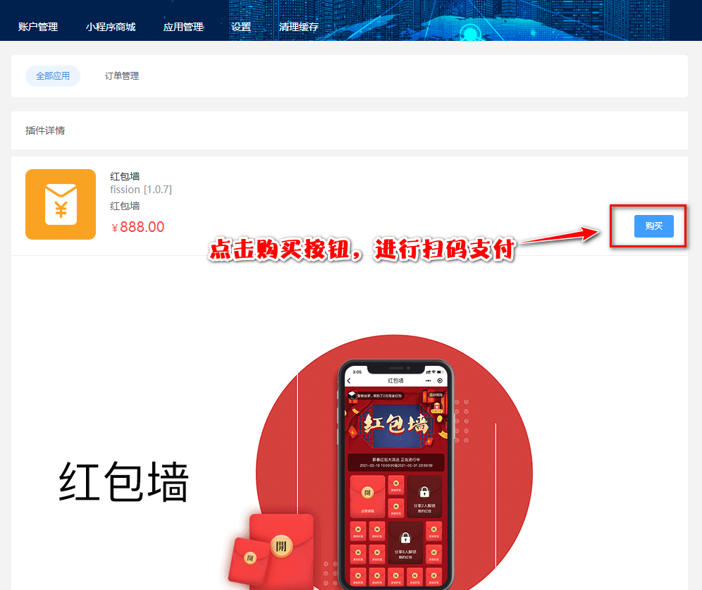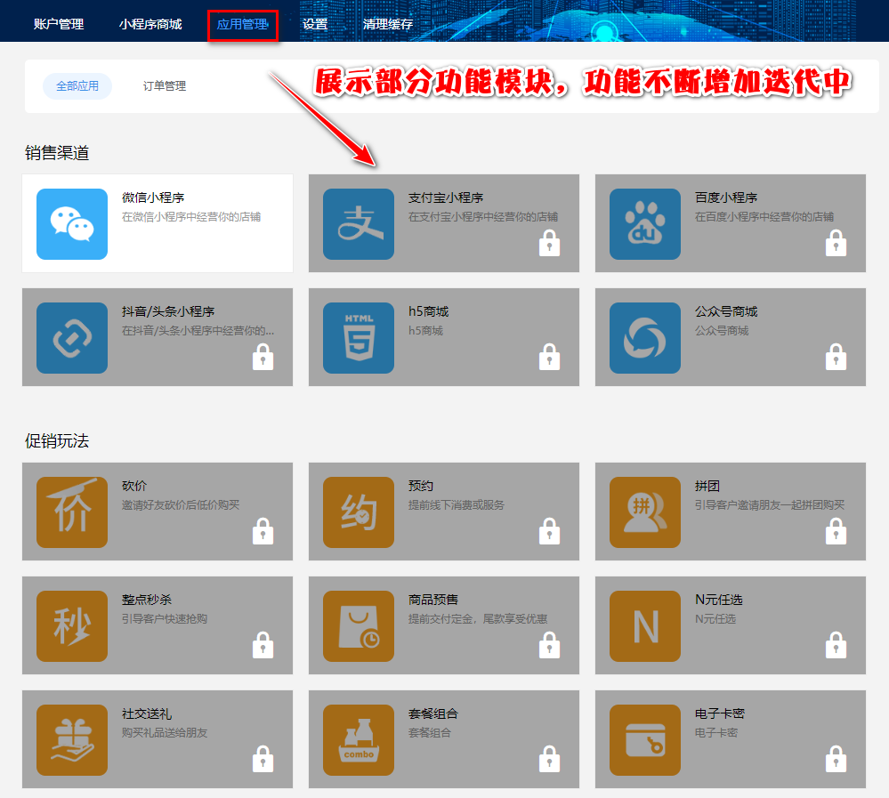 功能自动开通 用户可以通过自助购买方式,开通想用的功能,不再需要人工客服的干预,更加人性化。 进入应用管理  选择对应功能模块,进行支付购买对应应用。  3.打开对应模块进行扫码支付,支付方式可以是微信,也可以是支付宝支付。  扫码支付 支付需要开通特定产品: 支付宝开通:  微信开通:  支付配置参考公众号h5功能那边的微信跟支付宝配置链接  如需要取消支付,点关闭即可