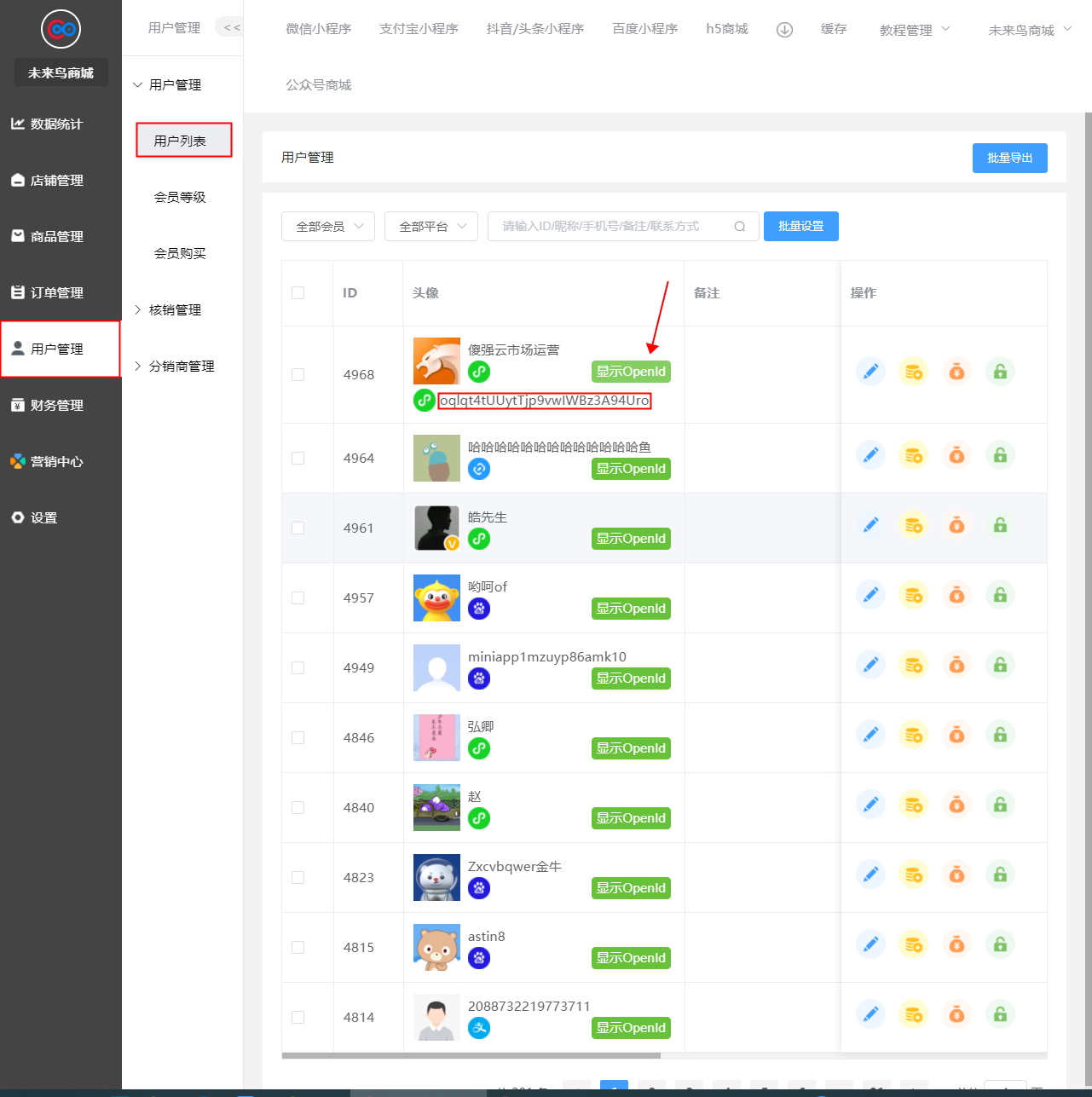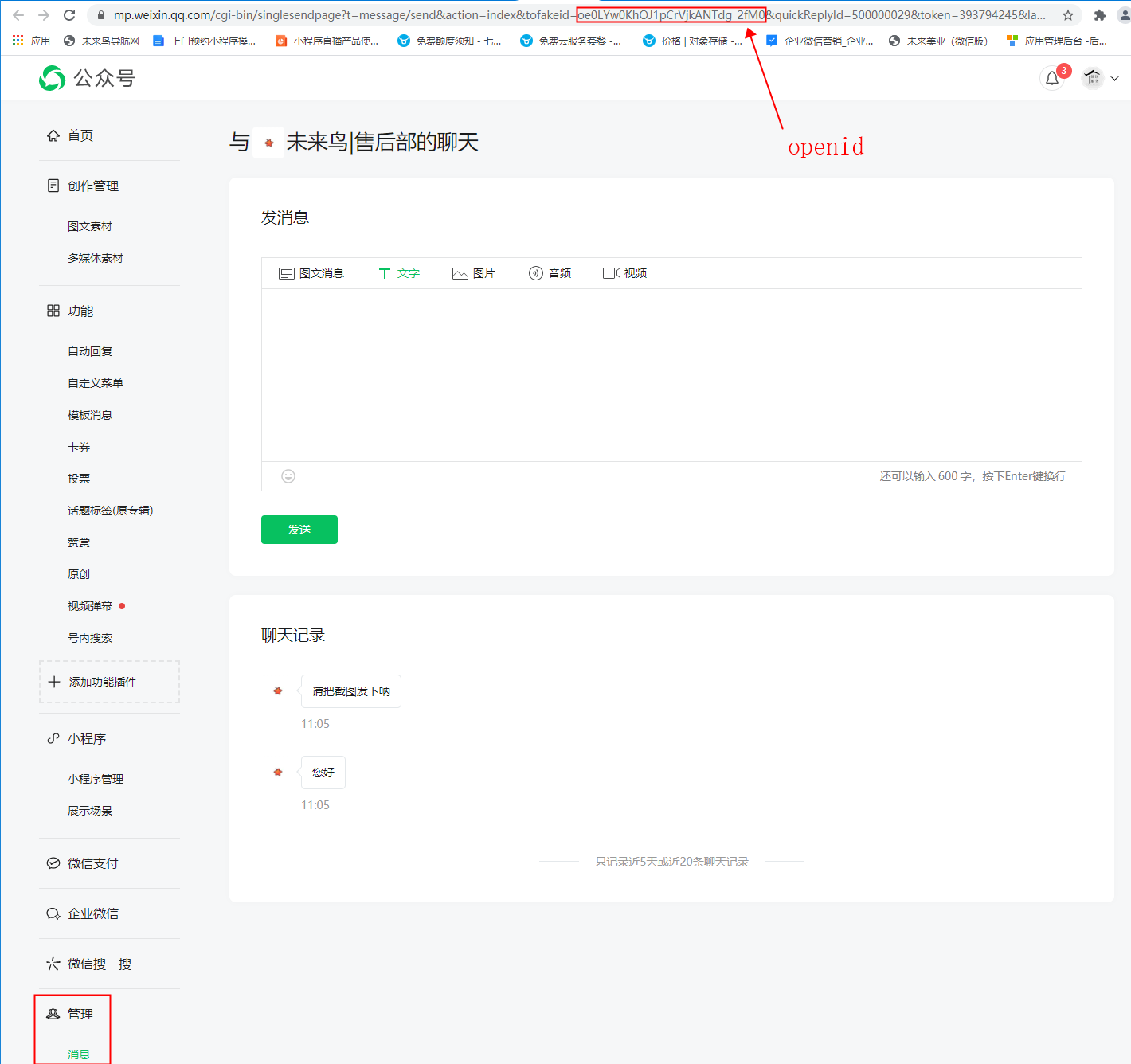 ## ==通用篇== 1.关注公众号,在公众号中回复任意消息 [图片]  2.登录微信公众号平台,进入消息管理,点击刚刚回复的消息  3.复制openID  ## 超级商城和超级云店篇 ==1、超级商城获取openID==  ==2、超级云店获取openID==