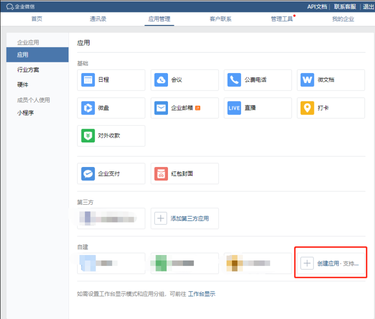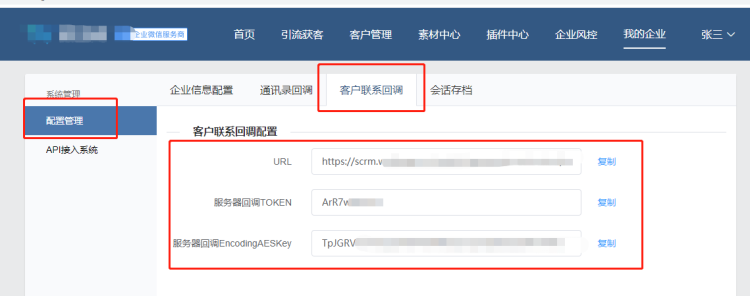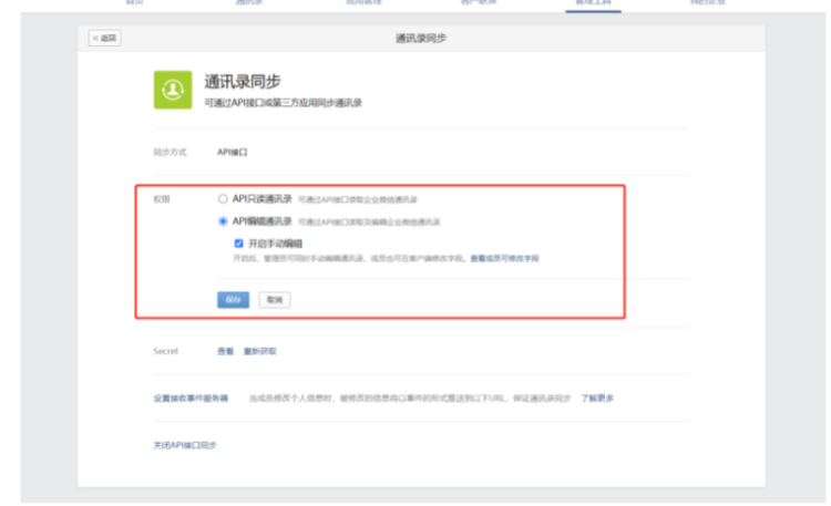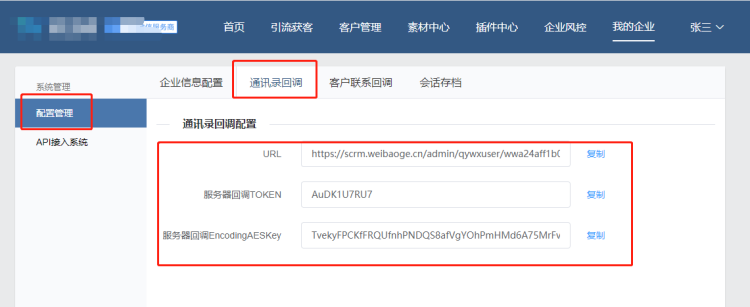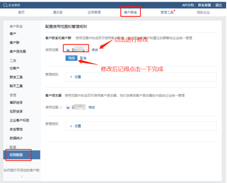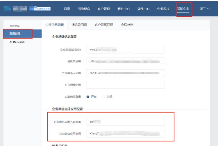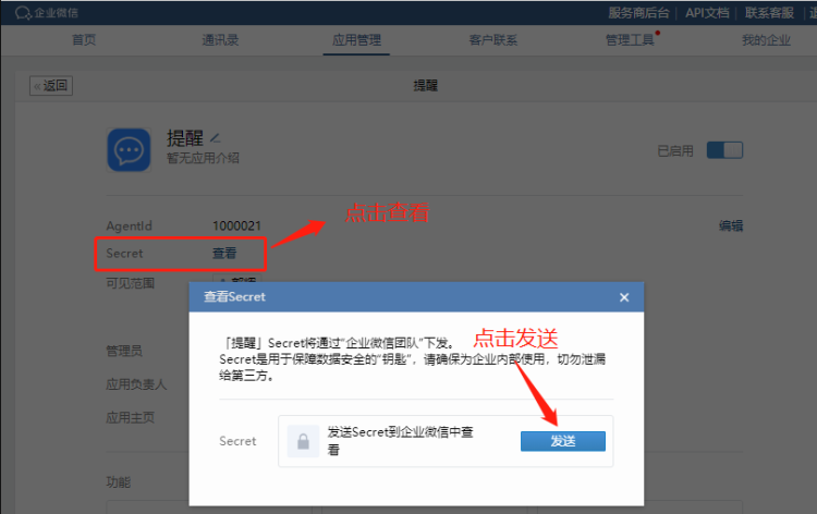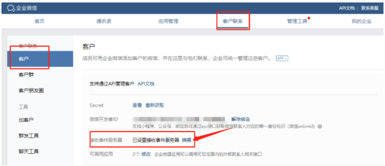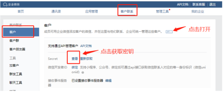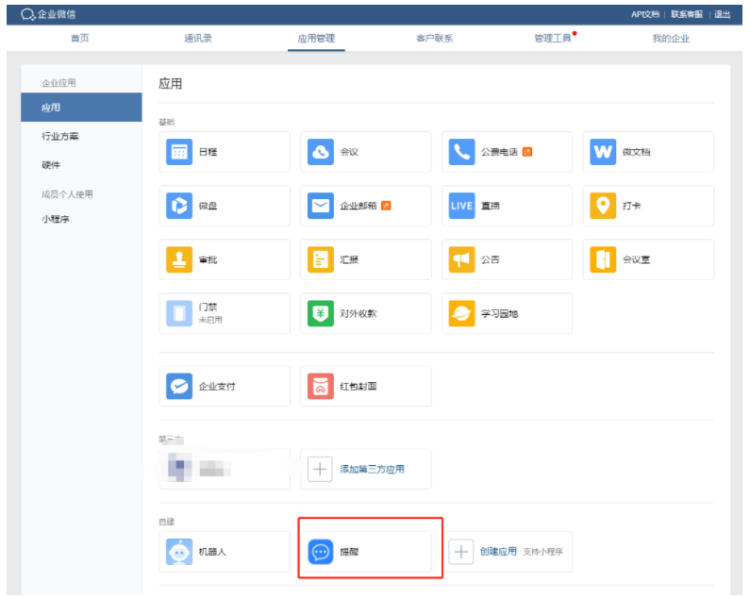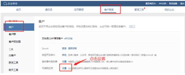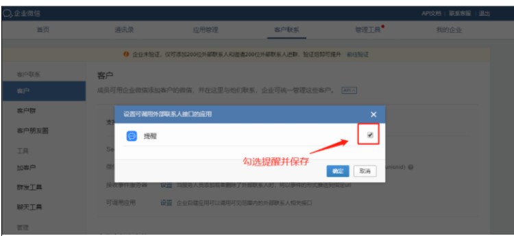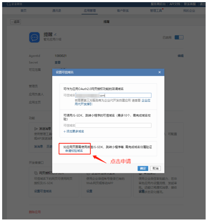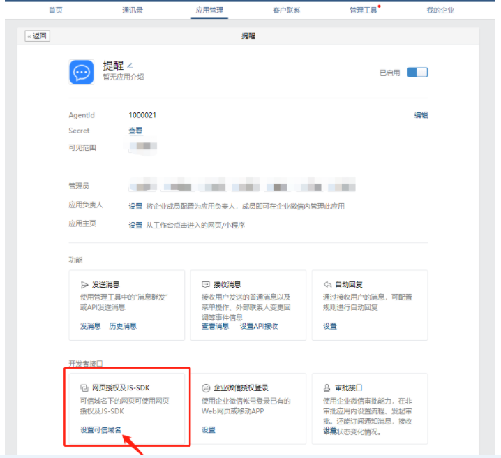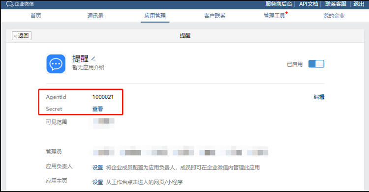 ## 配置教程 ## 1) 登录企业微信后台,创建自建应用 ● (1) 打开**【应用管理】,在【自建】下选择【创建应用】**  ● (2) 创建自建应用名称建议填写 提醒,建议选择下面图片logo进行上传,不用填写应用介绍。  ● (3) 在**【可见范围】内【选择部门/成员】**,可先选择授权给本人,之后若需要添加使用人员时可再次添加  ## 2) 将自建应用的agentid和secret复制出来  ● 创建成功后,在创建的【提醒】内找到Secret和Agentld,复制并填写到下图所示地方。     ## 3) 添加员工到客户联系 ● 选择**【客户联系】-【权限配置】,点击【添加/修改】**将成员添加到使用范围,建议选择全部成员 ● 员工只有配置了【使用范围和管理规则】才可以使用客户联系,添加外部联系人等权限,请确保客服等人员被添加客户联系权限,否则可能会导致部分功能无法使用  ## 4) 修改客户改应用权限 ● (1) 切换到**【客户联系】-【客户】,点击【API】展开,复制Secret后,填写到下图所示地方。     ● (2) 填写Secret后,选择【可调用应用】,点击【设置】,如果在此之前已经进行过应用配置,点击【修改】  ● (3) 勾选之前创建的【提醒】  ● (4) 将以下内容依次填写到页面【接收事件服务器】下对应的输入框中   ## 5) 提交通讯录应用权限  1. 登录企业微信后台,进入“ 管理工具--通讯录同步” 2. 开启API接口同步  3. 点击编辑,选择API编辑通讯录,开启手动编辑,保存   ● 将以下内容依次填写到页面【接收事件服务器】下对应的输入框中  1. 保存后会自动跳转接受事件消息服务器设置,将系统上的信息复制到此处保存即可,然后点击返回   2. 进入客户联系-权限配置中将下图所示使用范围勾选为使用系统的成员或勾选整个企业  ## 6) 获取通讯录秘钥并填写    ● 在管理工具-通讯录同步内找到Secret,复制并填写到下图所示地方。  ## 7) 配置应用属性 ● 在创建应用成功后,进入**【提醒详情页】找到【开发者接口】中的【网页授权及JS-SDK】页面,点击【设置可信域名】**,进行设置   ● 第一步:复制当前域名,不用http或https填写到输入框 ● 第二步:填写完成后点击【申请校验域名】  ● 第三步:直接勾选【用于OAuth2.0回调的可信域名是否校验】即可