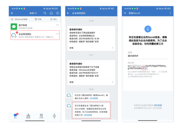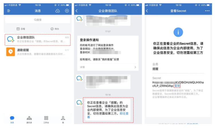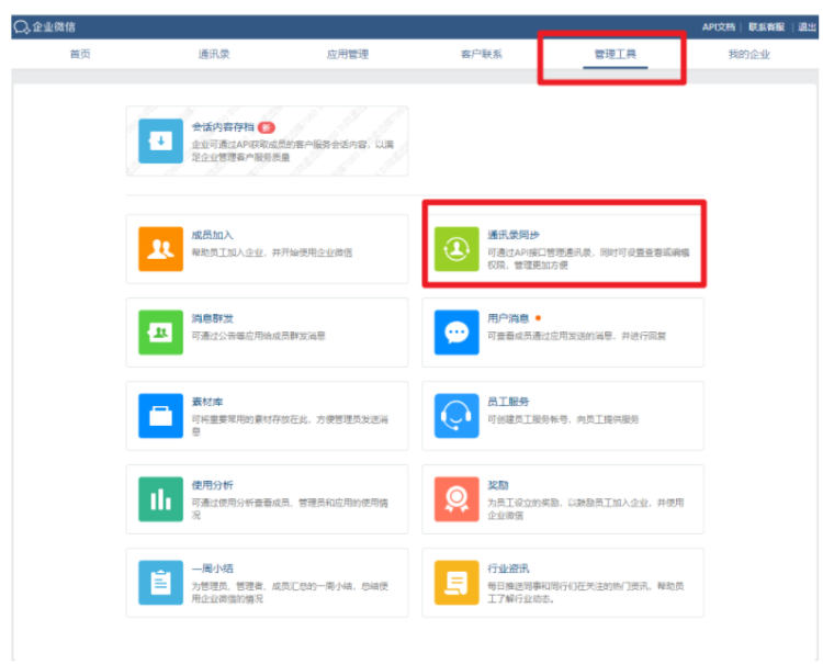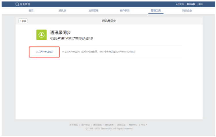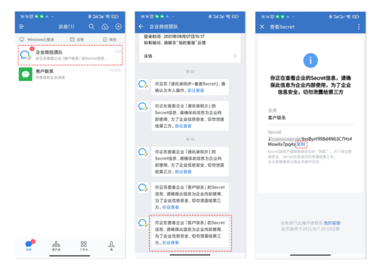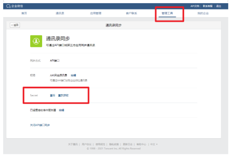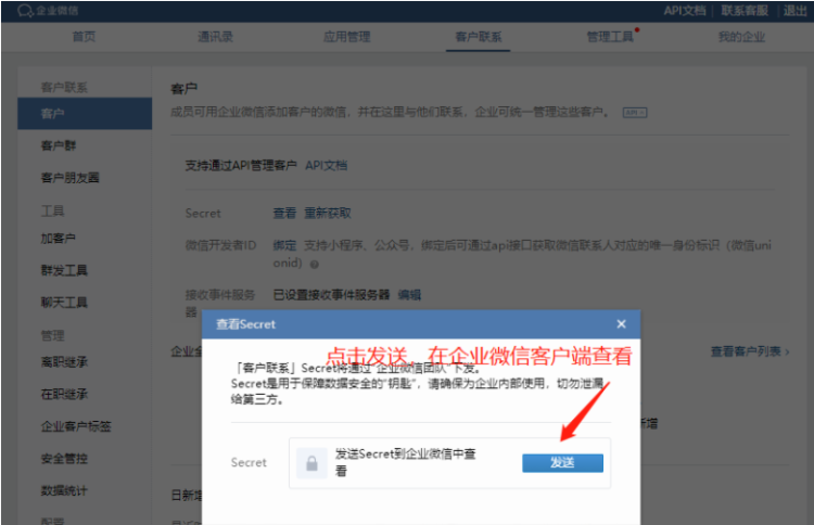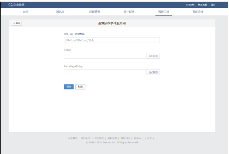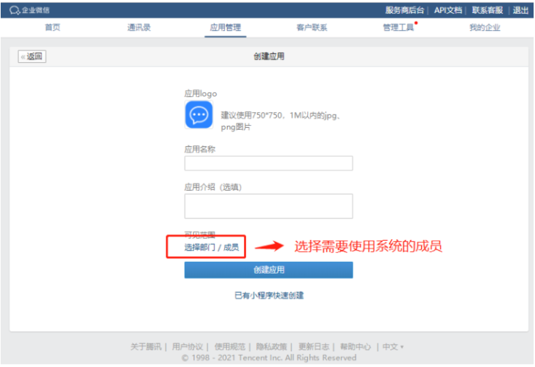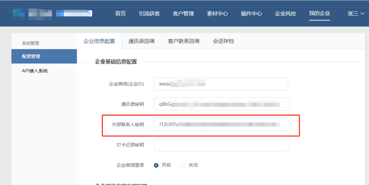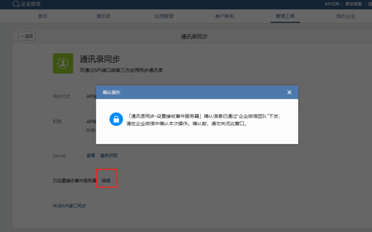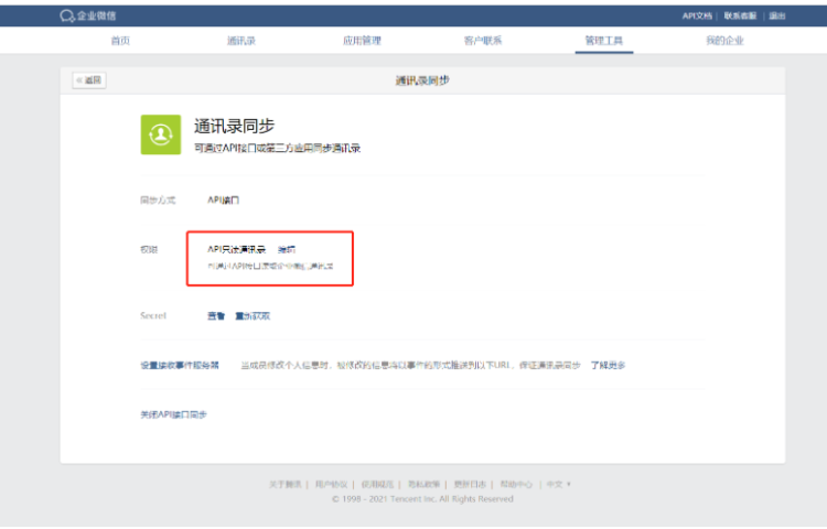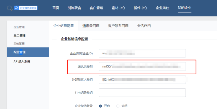## 配置教程 ## 1) 登录企业微信后台,创建自建应用 ● (1) 打开**【应用管理】,在【自建】下选择【创建应用】**  ● (2) 创建自建应用名称建议填写 提醒,建议选择下面图片logo进行上传,不用填写应用介绍。  ● (3) 在**【可见范围】内【选择部门/成员】**,可先选择授权给本人,之后若需要添加使用人员时可再次添加  ## 2) 将自建应用的agentid和secret复制出来  ● 创建成功后,在创建的【提醒】内找到Secret和Agentld,复制并填写到下图所示地方。     ## 3) 添加员工到客户联系 ● 选择**【客户联系】-【权限配置】,点击【添加/修改】**将成员添加到使用范围,建议选择全部成员 ● 员工只有配置了【使用范围和管理规则】才可以使用客户联系,添加外部联系人等权限,请确保客服等人员被添加客户联系权限,否则可能会导致部分功能无法使用  ## 4) 修改客户改应用权限 ● (1) 切换到**【客户联系】-【客户】,点击【API】展开,复制Secret后,填写到下图所示地方。     ● (2) 填写Secret后,选择【可调用应用】,点击【设置】,如果在此之前已经进行过应用配置,点击【修改】  ● (3) 勾选之前创建的【提醒】  ● (4) 将以下内容依次填写到页面【接收事件服务器】下对应的输入框中   ## 5) 提交通讯录应用权限  1. 登录企业微信后台,进入“ 管理工具--通讯录同步” 2. 开启API接口同步  3. 点击编辑,选择API编辑通讯录,开启手动编辑,保存   ● 将以下内容依次填写到页面【接收事件服务器】下对应的输入框中  1. 保存后会自动跳转接受事件消息服务器设置,将系统上的信息复制到此处保存即可,然后点击返回   2. 进入客户联系-权限配置中将下图所示使用范围勾选为使用系统的成员或勾选整个企业  ## 6) 获取通讯录秘钥并填写    ● 在管理工具-通讯录同步内找到Secret,复制并填写到下图所示地方。  ## 7) 配置应用属性 ● 在创建应用成功后,进入**【提醒详情页】找到【开发者接口】中的【网页授权及JS-SDK】页面,点击【设置可信域名】**,进行设置   ● 第一步:复制当前域名,不用http或https填写到输入框 ● 第二步:填写完成后点击【申请校验域名】  ● 第三步:直接勾选【用于OAuth2.0回调的可信域名是否校验】即可