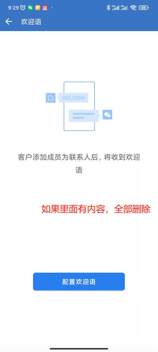 SCRM系统设置了 欢迎语、裂变引导语 失效。 请检查系统是否设置了欢迎语(如下图),如果有设置全部删除。 【原理是:SCRM设置欢迎语是通过API接口操作,如果系统中已有设置,优先使用官方设置好的欢迎语。造成我们欢迎语的失效】