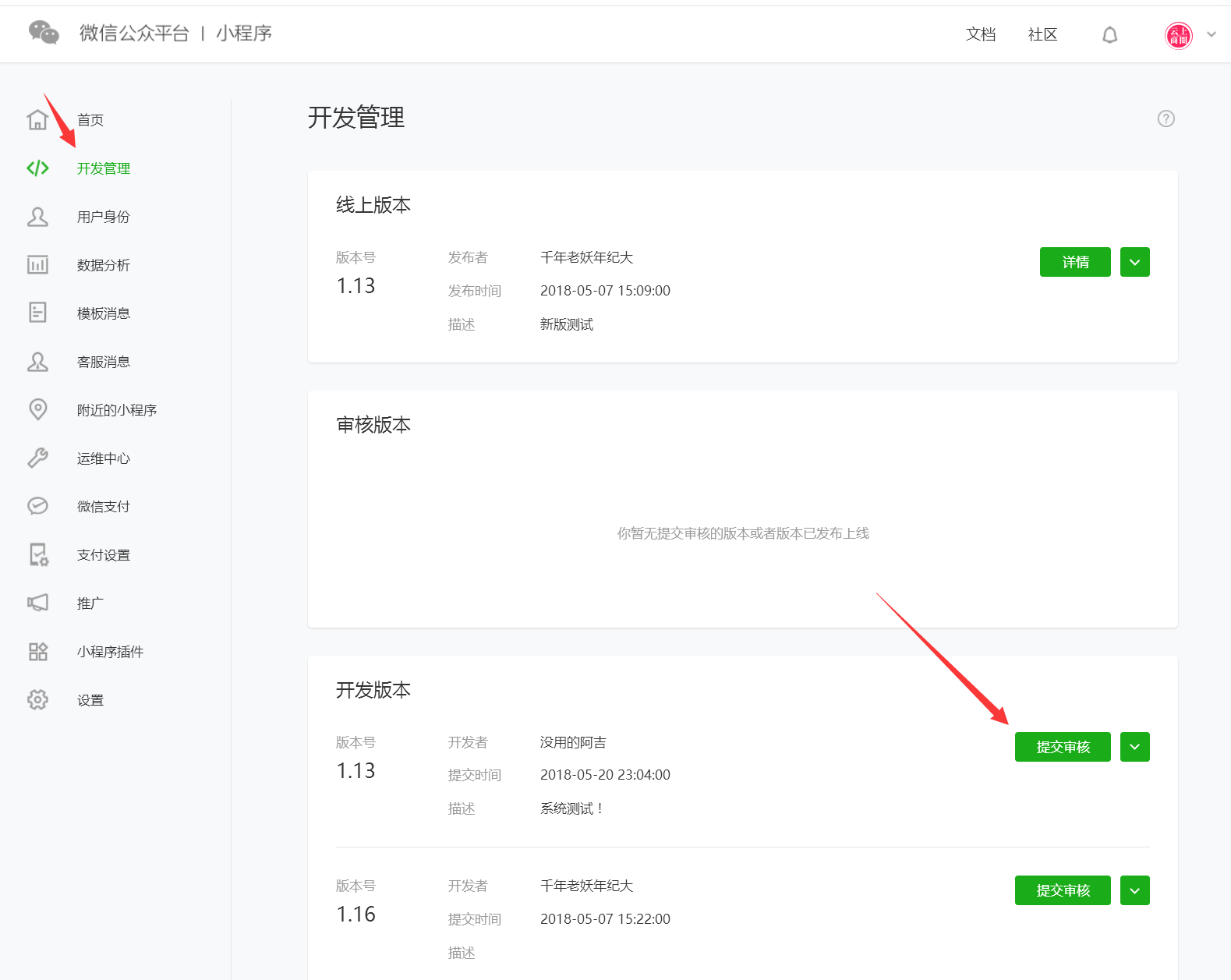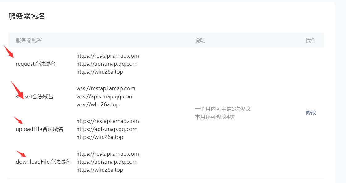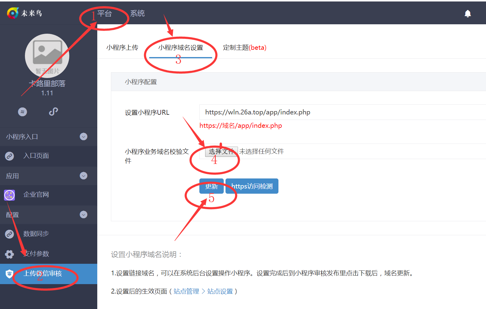 ### 前提 1.申请了微信小程序帐号 2.并通过了微信认证 ### 一.填写小程序信息 登录到微信小程序公众后台:[https://mp.weixin.qq.com/](https://mp.weixin.qq.com/ "https://mp.weixin.qq.com/") 请按照您的需要填写资料 小程序名称: 小程序头像: 小程序介绍 服务类目:请按照你行业所属的服务类目来选择和添加 填写完毕内容如下图(注意不要照抄XXXXX)  ### 二.整理对接到未来鸟平台需要的基础资料和域名设置 请整理好获取到如下资料,并使用文本来记录 注意:以下内容仅为范例,请为照抄 小程序原始ID:gh_6367c7130048449e 小程序APPDI:wx854d845def4cb354b83 小程序AppSecret: ec3f1910cf3932a3a53a745dd3e42179 #### 1.小程序原始ID 获取 小程序原始ID:  #### 2.开发设置获取AppID和AppSecret 注意:AppSecret 点生成以后,将需要管理扫码,而且这些密匙是不会保存在微信公众平台服务器上,请注意保存! 具体步骤,请看下图  #### 3.开始配置服务器域名 ##### 设置——开发设置——服务器域名——开始配置 ##### 请添加以下这几个域名进去,没有特殊需求,添加这三个域名即可! ###### restapi.amap.com ###### apis.map.qq.com ###### wln.26a.top  ##### 这四个合法的域名都填写成一样的! #### .4.未来鸟平台小程序添加 进入https://wln.26a.top 后台登录您的帐号 在小程序创建页面,点击去创建  选择手动添加小程序  新建单个小程序 打包生成小程序,仅针对开发者单个小程序插件.  设置小程序基础信息 这里的内容请从你的公众号或者你记录的文档中复制 特别注意的是版本号,必须使用以下格式:1.1.1 之类, 添加应用:请选择你要一键生成的小程序应用即可 完成后的范例图如下(请勿照抄) 然后点击下一步!  然后点击生成版本即可!  以后进入小程序配置页面 #### 请点击 平台 即可进入小程序配置页面 #### 请点击 应用 即可进入小程序内容页面  #### 5.业务域名设置 注意,到这里我们请先返回 https://mp.weixin.qq.com 后台 ##### 设置——开发设置——业务域名——开始配置 添加业务域名后,小程序内可调用组件打开限定域名内的网页。 业务域名没有特别要求只用填写 ###### wln.26a.top 保存即可 如果不可以保存,请下载校验文件然后上传到 wln.26a.top即可校验  ##### ‘下载校验文件’上传步骤 A.点击蓝色 下载校验文件 到本地  B.登录 wln.26a.top 平台 然后依次点击——平台——上传微信审核——小程序域名设置——上传(上传你刚下载的文件)——更新即可!  C,上传文件,并点击 更新 以后  我们在返回微信公众开放平台  点击保存即可!保存成功以后的效果图如下  #### 6.售后客服管理权限添加  请添加售后客服微信号: weilainiao2017 weilainiao2018 并给予全部权限 ###### 注意:以上2个为我们的两个售后专用员,你也可以添加你的小程序添加其他管理员!这里也可以选择不添加!如果不需要协助的话! 具体操作请看下图  #### 7.开发管理! A.登录 wln.26a.top 平台 ##### 然后依次点击——平台——应用(XXXXX)填充完内容以后 ##### 然后依次点击——平台——上传微信审核 ![] B.开发版可以在这里进行预览,进行小程序内容调试,微信扫码预览开版小程序  C.当你在开发版小程序中觉得没有问题,可以发布了时候,请点击 上传代码 按钮!  D.登录微信开放平台小程序后台——开发管理  ##### 提交最新的版本,注意,新提交的版本号要比原来的大 ##### 比如上次提交的是1.16 那么这次你要提交1.17 ##### 然后请注意您的管理员微信,审核通过以后会有模版消息通知  ##### 收到审核通过的通知以后,再次登录微信开发者平台——开发者管理——审核版本——点击右侧的 全量发布(意思是全网发布的意思),小程序就正式上线了! ![]
