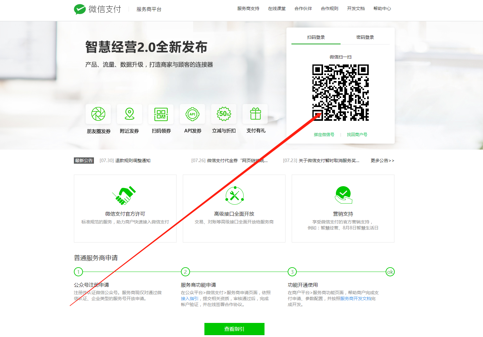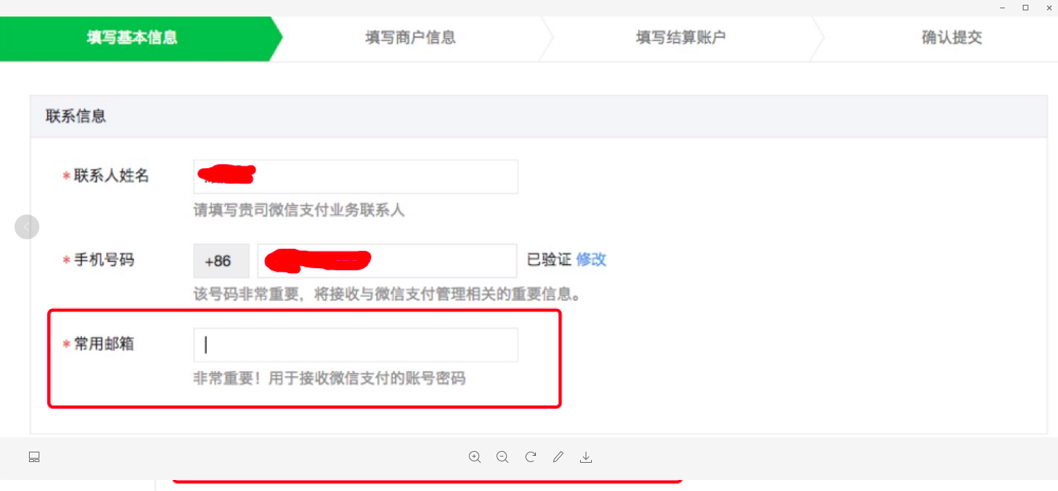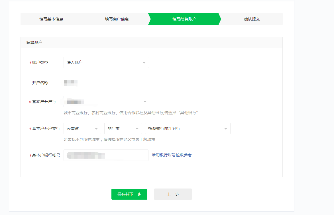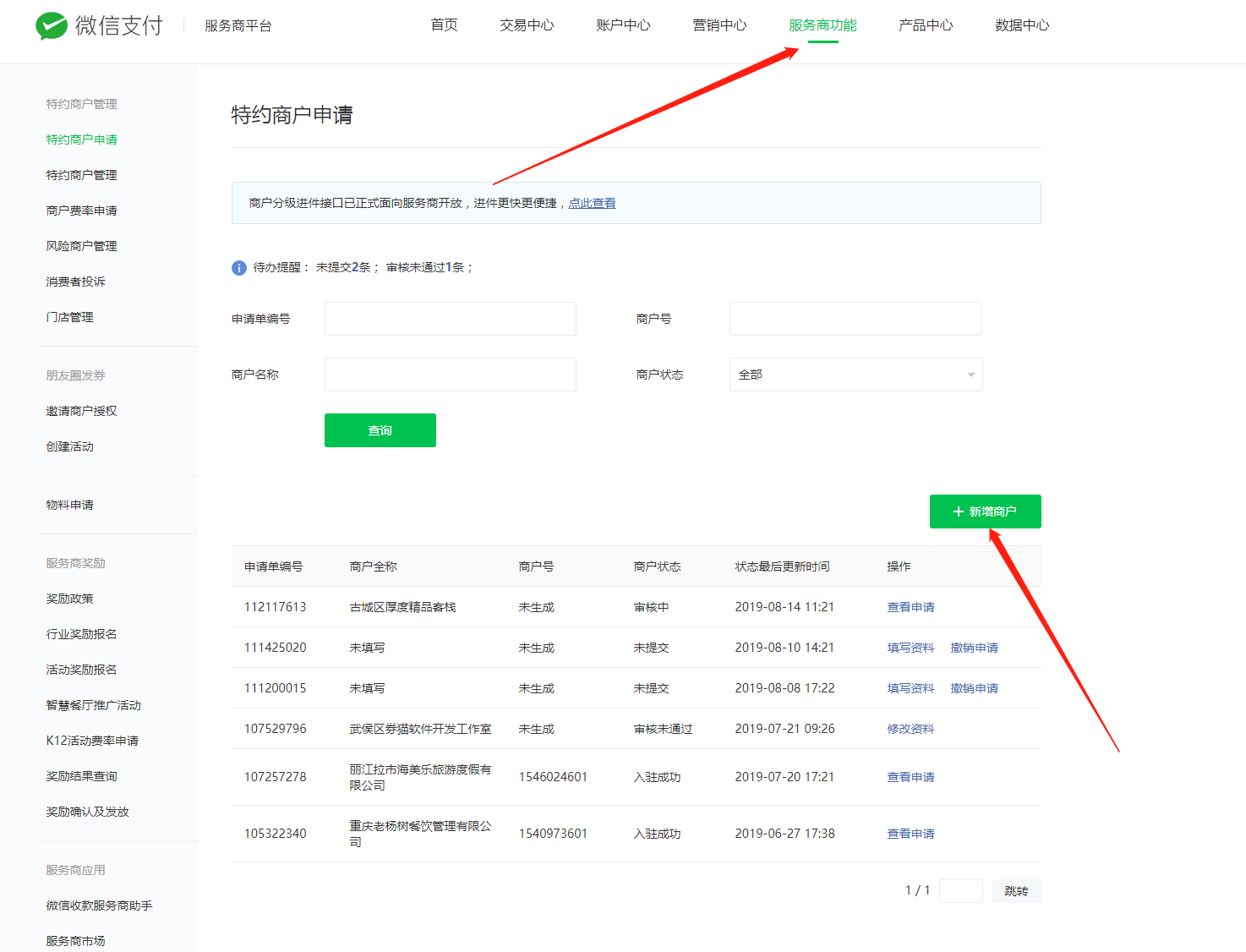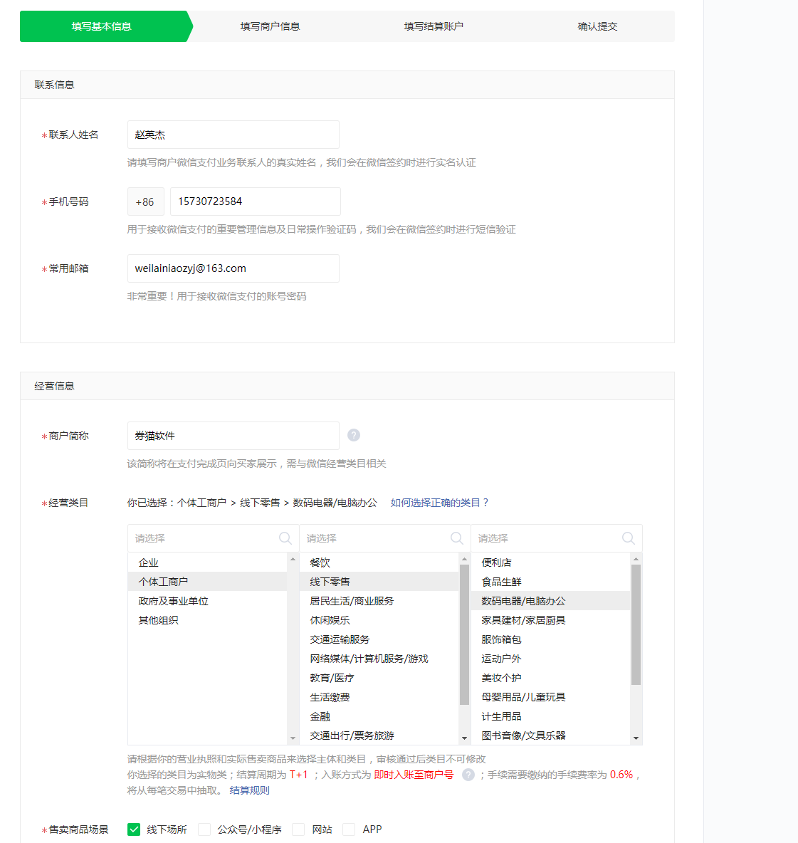 > 申请微信支付商户号需要的资料: 1.联系方式:商户联系人姓名、联系电话、联系邮箱。 > 2.经营信息:商品简介、商户简称、售卖商品(服务)类目、售卖资质证件(有些行业需要)。 > 3.结算信息:结算银行信息、结算银行卡号。 > 4.营业执照、法人身份证等信息将从您微信认证资料中获取,您可核对信息正确后,直接提交。 > 5.服务号或者小程序必须通过了微信认证。 ### 申请步骤 #### 1.小程序通过认证后,就可以进行微信支付的申请,登录小程序公众号后台,进入微信支付。登陆pay.weixin.qq.com扫二维码登陆  #### 2.点击服务商功能,再点击新增商户  #### 3.填写基本信息,填完点击保存下一步  #### 4.填写商户,保存并下一步  ##### 请按照自己企业的经营类目选择相应的行业并上传所需证件照 #### 5.然后是结算账户的填写  #### 6.结算账户的填写,填写好后,进行提交就可以了。 ## 温馨提示: ### 1、审核的时间为7个工作日。 ### 2、若审核不通过,可在微信公众平台“通知中心”查询审核不通过的原因,请修改后在重新上传。 ### 3、微信支付的申请不需要缴纳任何保证金。 ### 4、审核通过时,微信会将微信支付的商户号、密码和相关信息发送至填写基本资料时设置的邮箱中(如下图),只要查看微信发来的邮件即可。