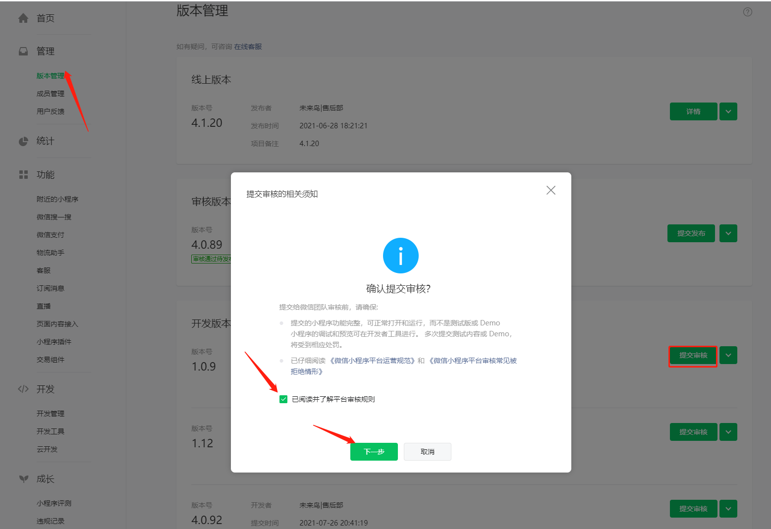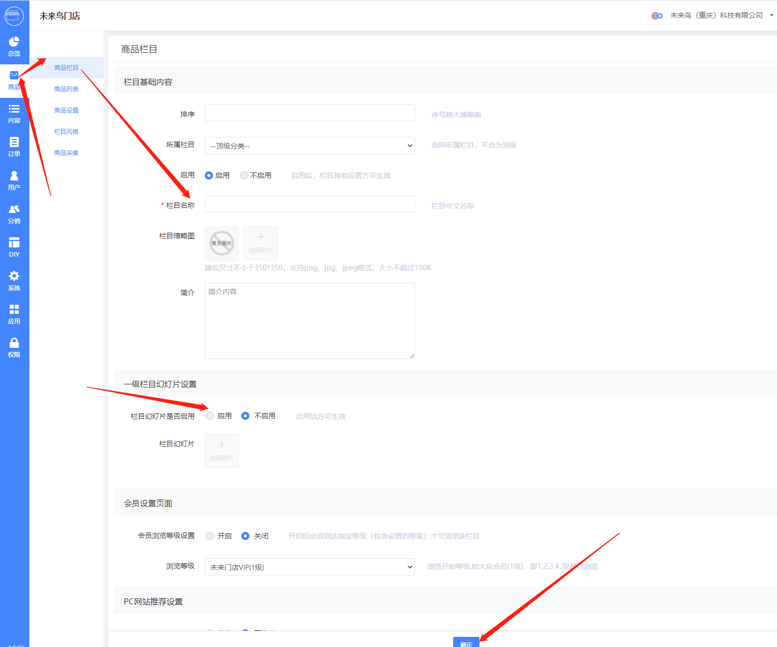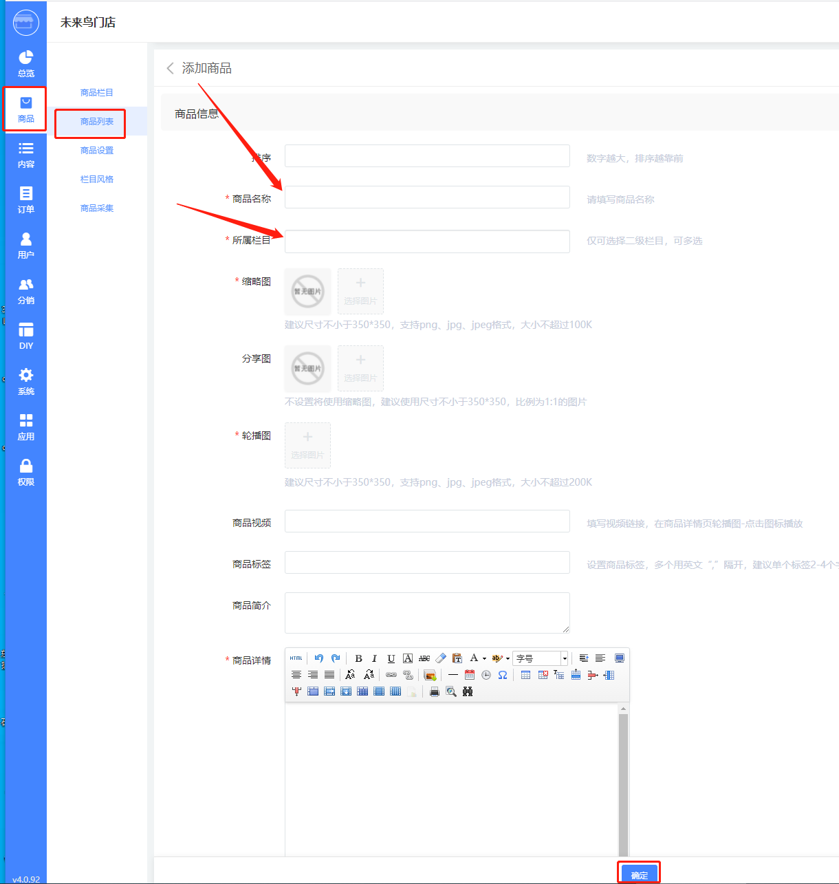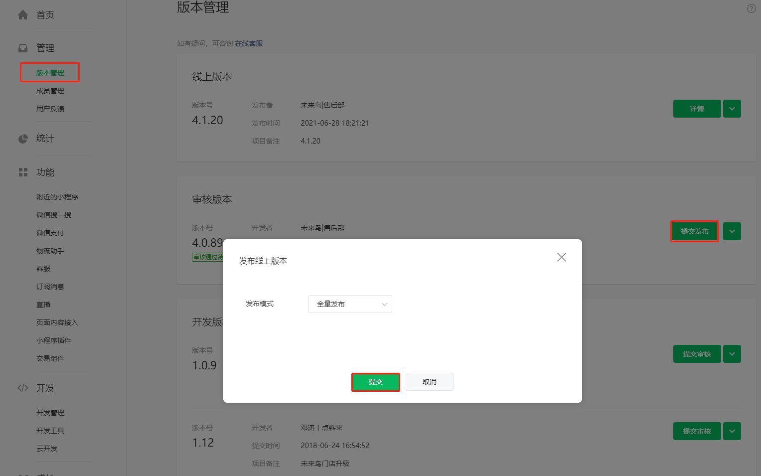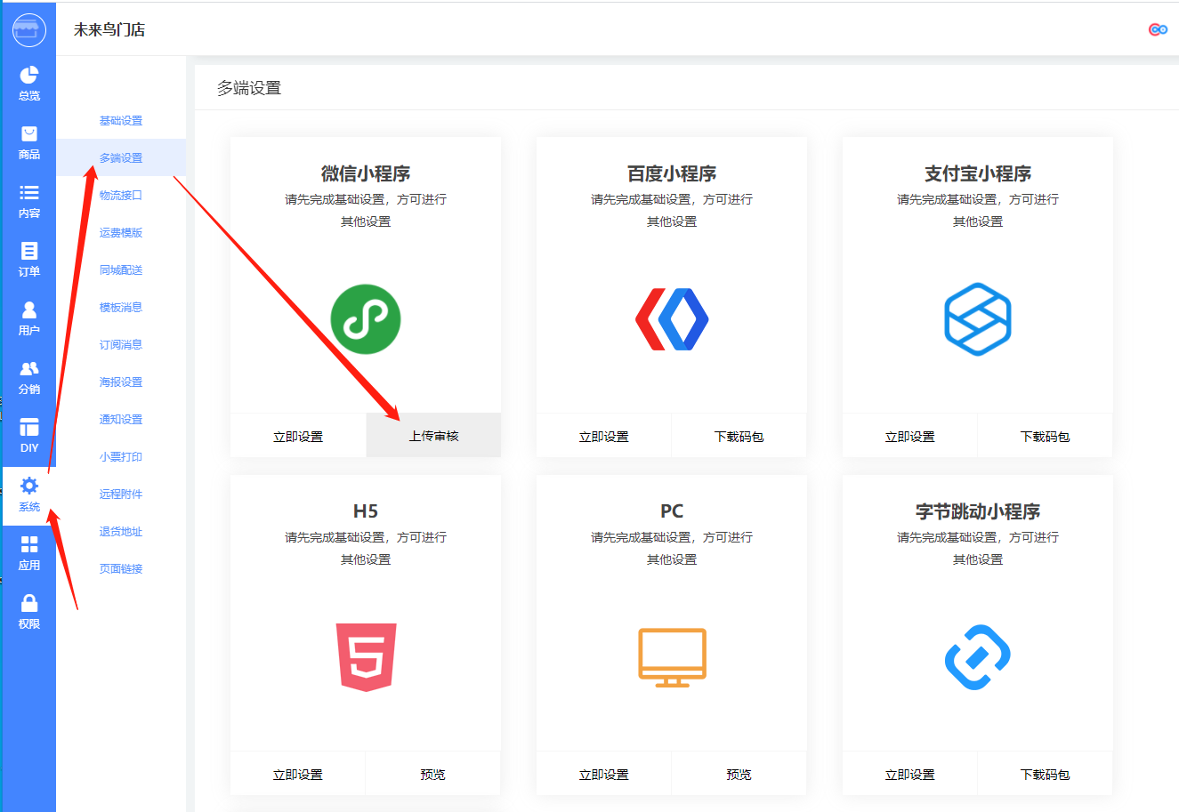 ### 一.选择模版或进行DIY设计 1.进入小程序管理后台,点击设计,进入页面装修,选一个模板选择启用模板  ## 二.添加商品栏目和商品 1.进入小程序管理后台,商品 商品栏目,添加栏目   2.添加商品,填写商品信息,提交保存即可   ## 三.提交审核并上传发布 1.进入小程序管理后台,点击系统 多端设置 微信小程序点击上传审核   2.微信公众平台登录小程序,进入后,点击管理,版本管理找到我们提交的版本,提交审核  3.待审核通过后,管理员提交全量发布  ## 四.支付收款和退款测试 小程序发布上线后,在商城选择一款商品,购买测试一下能否正常支付和退款,如果不能,需要重新检查微信支付配置